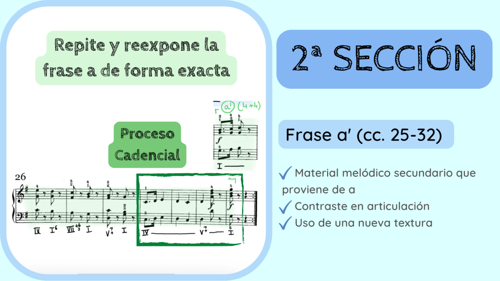 Tras la frase b se reexpone la frase inicial, el personaje principal. Esta vez, aunque mantiene su estructura interna de 4 + 4, finaliza sobre un proceso cadencial para marcar, de forma clara, el final. Hay que señalar que las dos frases a idénticas y la frase b terminaban en semicadencia. Esta por el contrario marca una Cadencia Auténtica con un proceso cadencial, es decir, que aparecen las tres funciones tonales básicas de Subdominante, Dominante y Tónica.