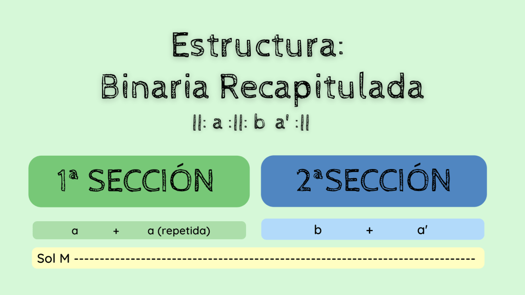 Para finalizar, aquí os dejo como siempre, este esquema en el que podéis observar el planteamiento tonal de la pieza. Se trata de una estructura binaria recapitulada. Esta forma es típica de piezas breves o de secciones de estructuras más grandes como el minueto o el tema y variaciones. La estructura binaria recapitulada se caracteriza por presentar dos secciones claramente diferenciadas y divididas por las dobles barras de repetición. De ahí su nombre de binaria. Lo de llamarse reexpositiva es por lo siguiente: la primera frase se repite: bien por estar entre dobles barras o bien se vuelve a escribir, habitualmente con cambios y no como en este caso que era literal. La segunda sección se inicia con una frase b, distinta o en algunos aspectos contrastante con lo anterior para terminar en una reexposición de la frase inicial a. Esta segunda sección también suele estar entre dobles barras. Y es esa reexposición de la frase a’ la que le da el nombre.