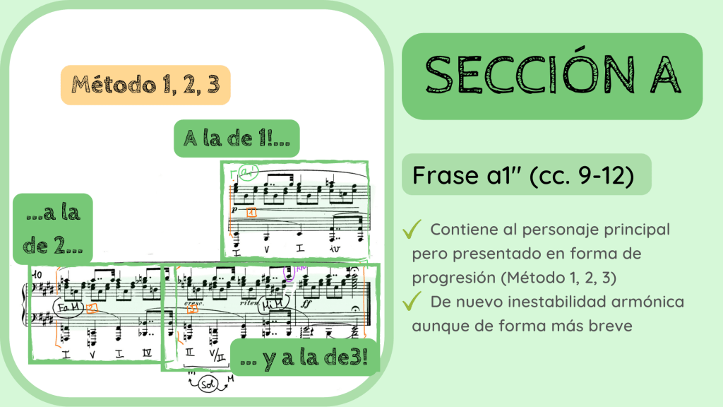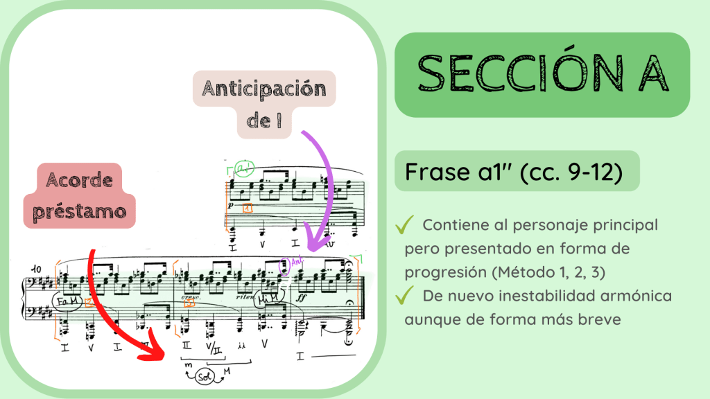 Tras el clímax y la vuelta a Mi Mayor, el c. 9 presenta la Tónica y, por lo tanto, un reposo de toda la tensión armónica anterior. Se inicia así la última frase que parece ser un retorno a la frase a1 principal aunque, se puede observar que nada más empezar, en el cuarto tiempo del c. 9, ya se presenta un acorde préstamo con un Do natural. Aún así, esta nueva frase tiene un carácter de reexposición. Y sobre su contorno melódico cabe señalar que sólo resulta ser un camino ascendente, éste de un rango, otra vez, de 4ª Justa, que va desde el Si hasta el Mi.