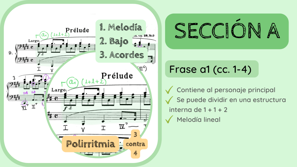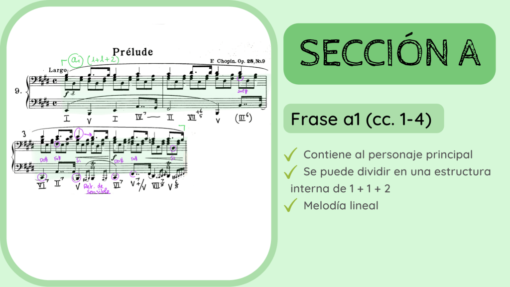 Pero vayamos más al detalle. En este primer compás vamos a encontrar varios elementos que van a ser los que Chopin, durante el resto del preludio, desarrolle.