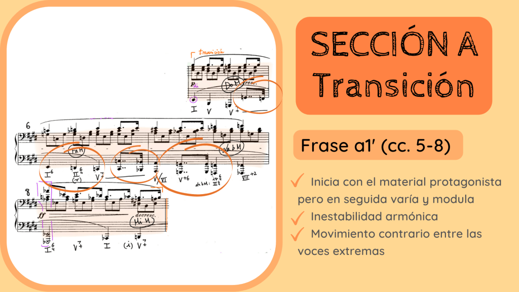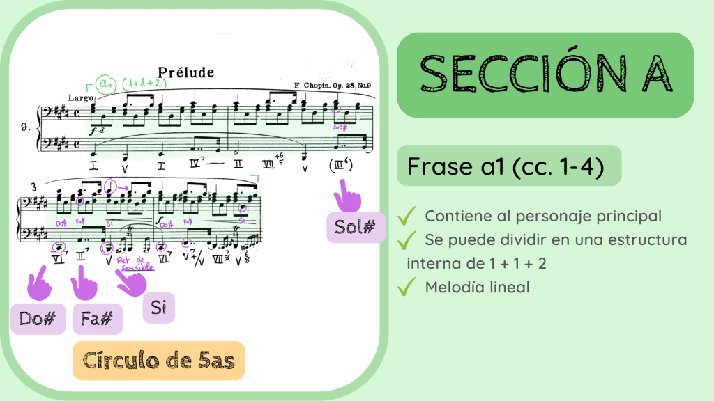 Hacia el final de la primera frase se puede observar un círculo de quintas, un proceso típico de la tonalidad que en este caso no aparece por completo en el bajo, sino que la progresión de notas señaladas en la diapositiva la encontramos entre el bajo y una de las voces internas. Pero si observamos con más detalle se puede ver como después de la secuencia Sol#-Do#-Fa#-Si, la siguiente nota que debería aparecer sería el Mi en el c. 4, pero Chopin la evita. ¿Por qué? Porque está retrasando la resolución. Vuelve a repetir en el c. 4 la progresión de Sol#-Do#-Fa#-Si y, por fin, en el c. 5, resolverá sobre la nota Mi, generando así el final conclusivo del círculo de quintas que todos esperábamos.