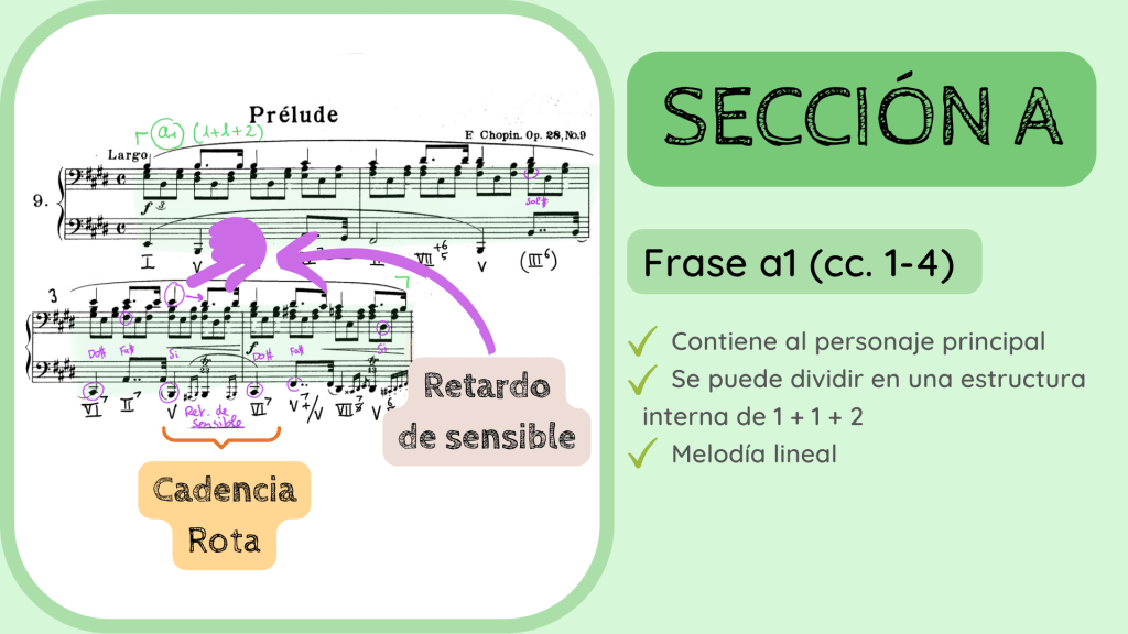Precisamente ese corte en el círculo de quintas, esa resolución inesperada del Si sobre el inicio de otro círculo de quintas con el Do# genera una sonoridad de Cadencia Rota. Es decir una secuencia de V-VI. Este giro inesperado es aún más reforzado por el Retardo de sensible señalado en la diapositiva, puesto que tras el movimiento de Mi-Re# nuestros oídos deseaban escuchar el Mi de nuevo. Vaya, la resolución de la sensible Re# a la tónica. Pero Chopin frustra esta necesidad, posponiendo la resolución sobre una Cadencia Auténtica.