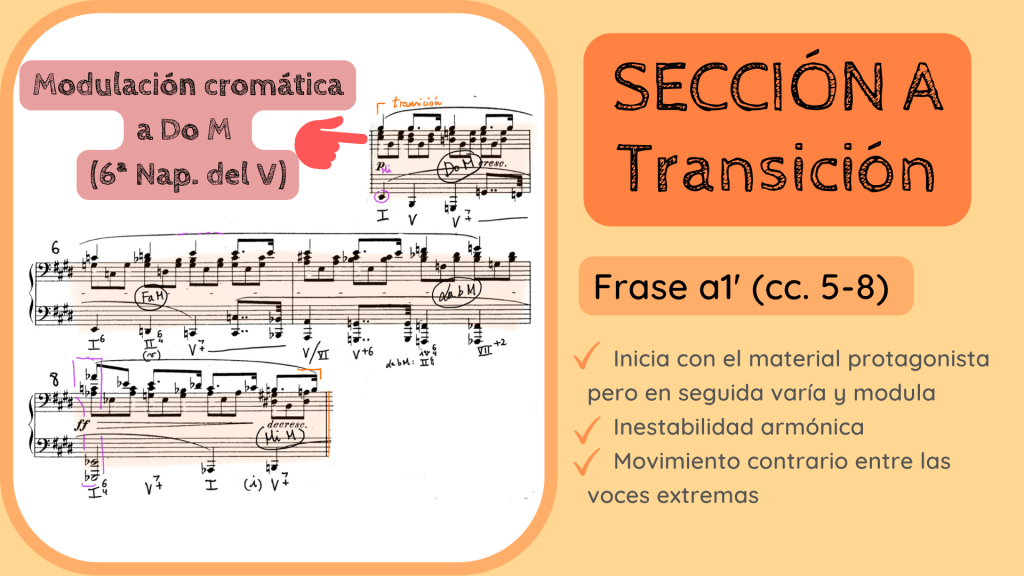 Para concluir, en cuanto a la armonía cabe señalar dos últimos detalles de esta frase final. Por un lado las modulaciones que se producen poco antes de concluir la obra. Primeramente a Fa Mayor. ¿Qué pinta esta tonalidad con respecto a Mi Mayor? Pues sí, seguro que alguno lo ha pensado. Otra vez la relación de 6ª Napolitana. Fa Mayor como Región Napolitana de Mi Mayor.
