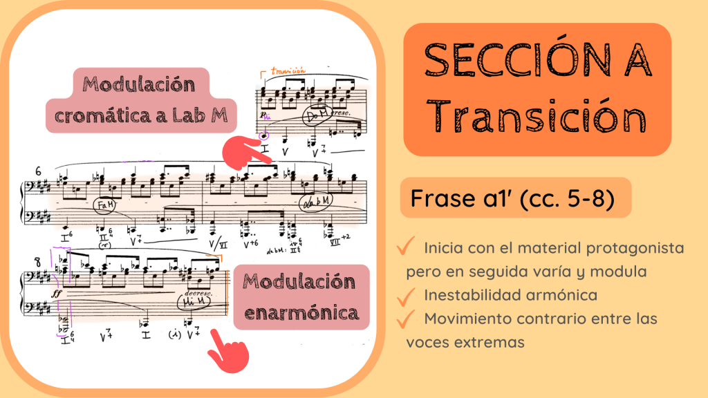 Las siguientes dos modulaciones también son muy interesantes. La primera de ellas de Fa Mayor a Lab Mayor se produce por una relación entre tonalidades homónimas. Lab Mayor está muy alejada tonalmente de Fa Mayor, pero en cambio Lab M es la tonalidad relativa de Fa menor. Es por ello que la modulación se produce a partir del acorde préstamo del tercer tiempo del c. 7, que contiene el Reb. Una vez escuchado ese acorde de Sib menor, éste actúa de acorde puente entre ambas tonalidades.