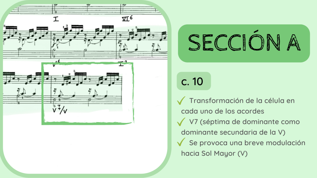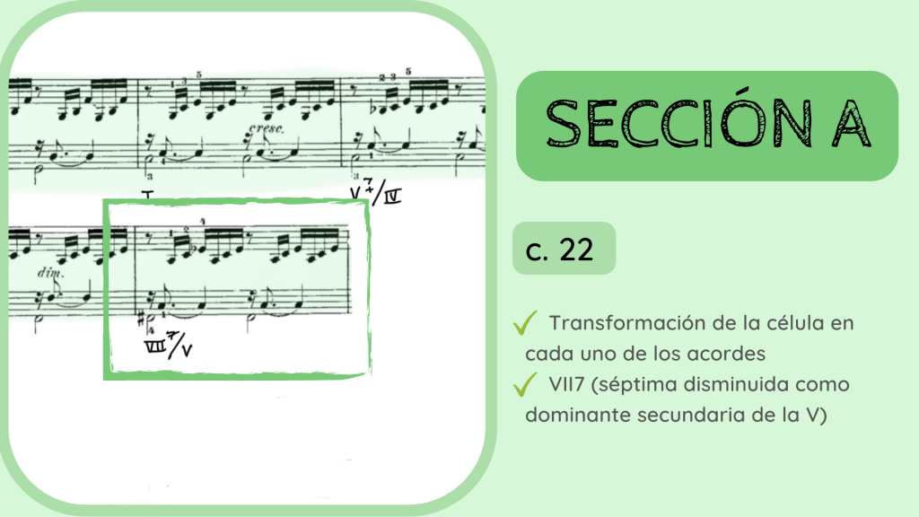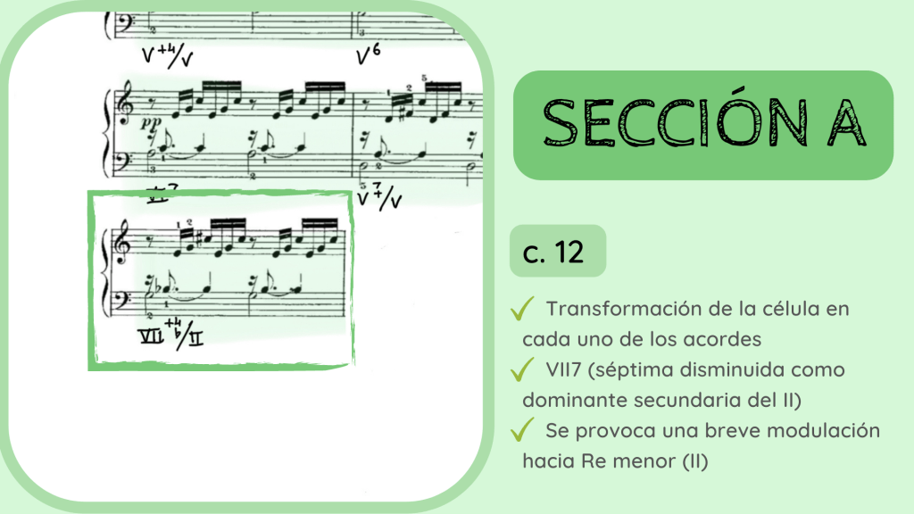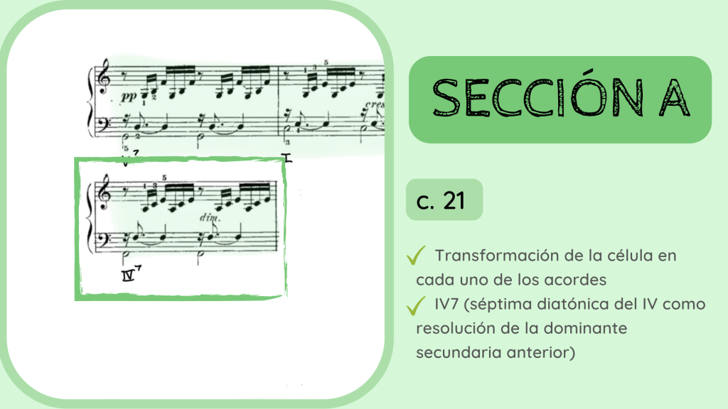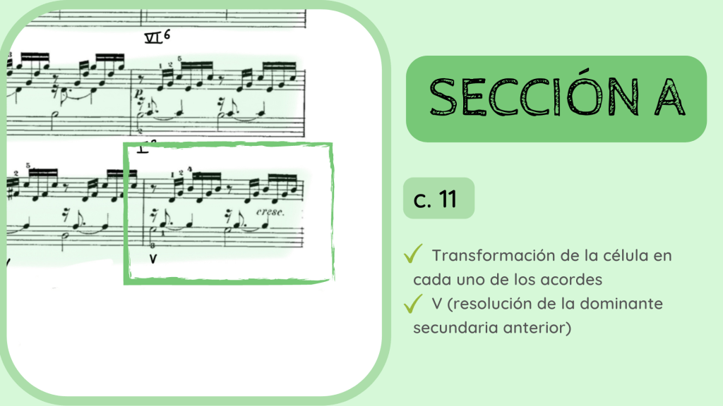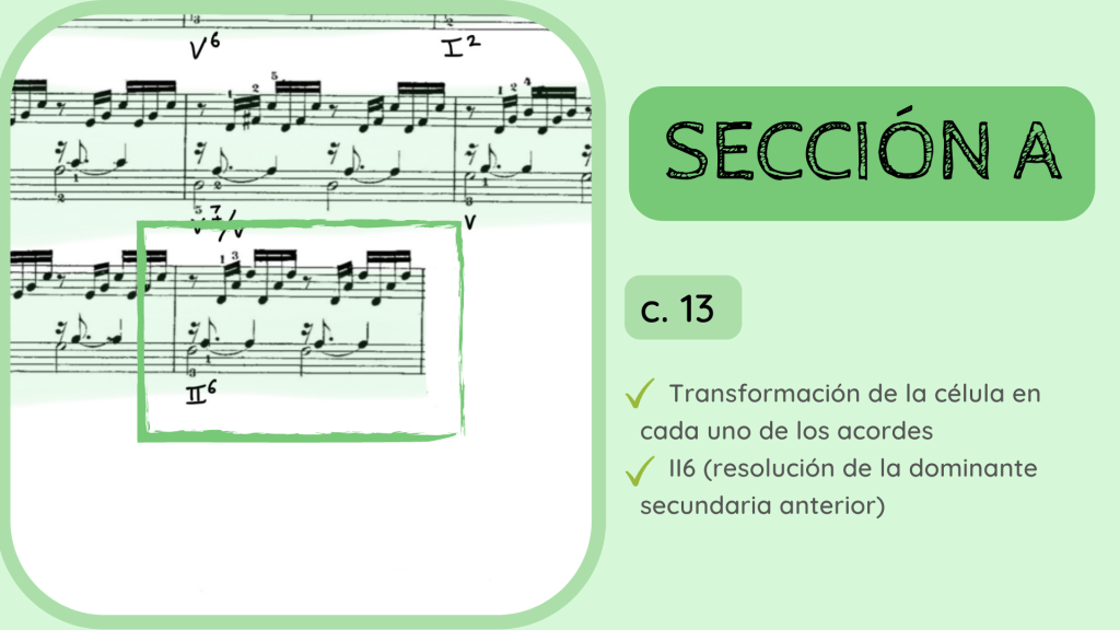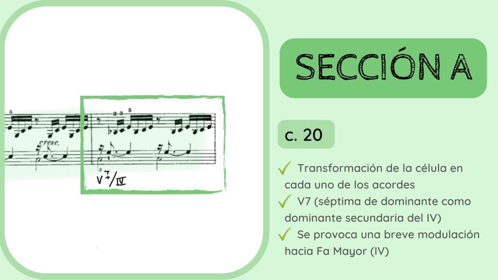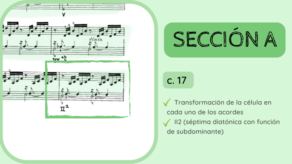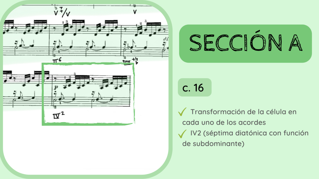 Tras la dominante secundaria esta resuelve en el IV. Por primera vez se rompe el motivo melódico-rítmico original y surge un acorde de IV desplegado que hacia mitad de compás presenta la nota Re, la que hace que el acorde se transforme del IV al II con séptima diatónica.