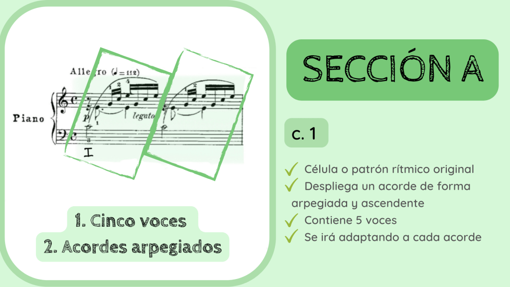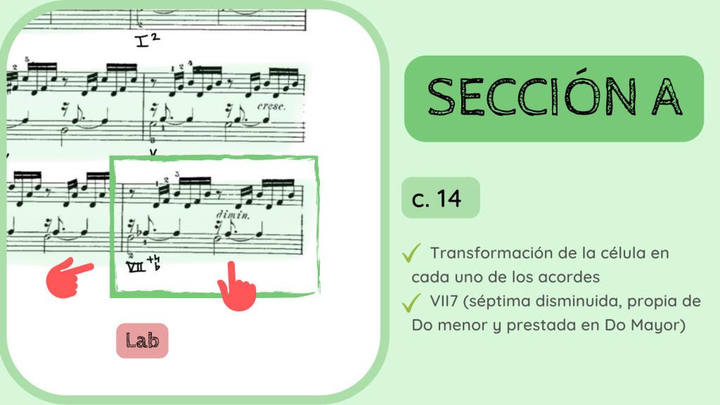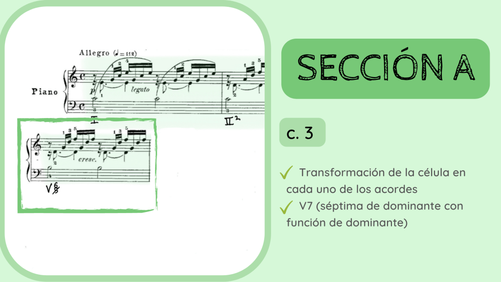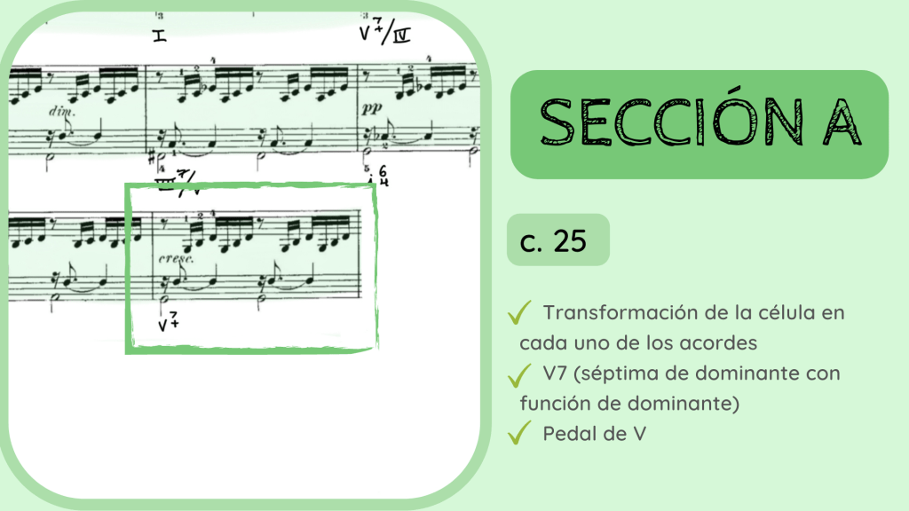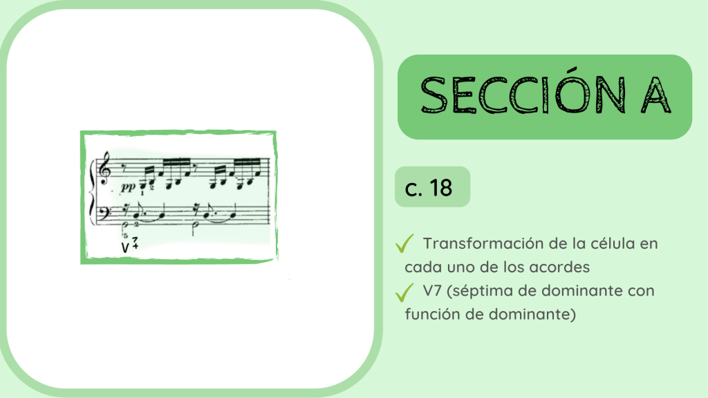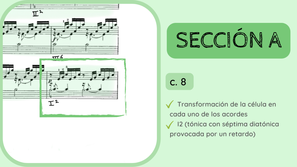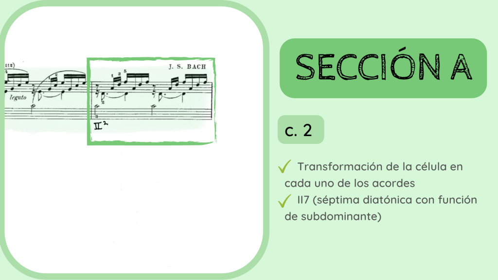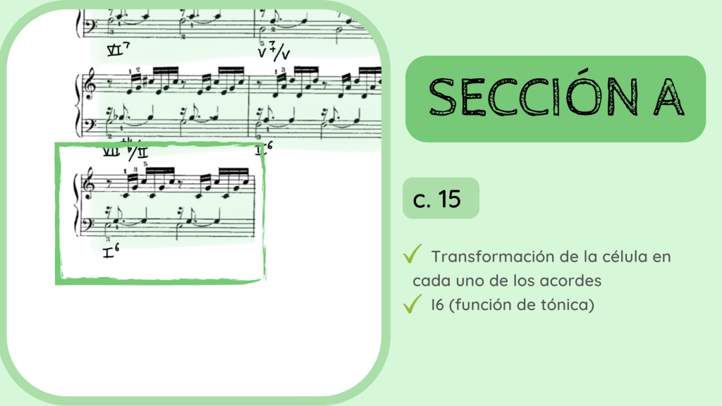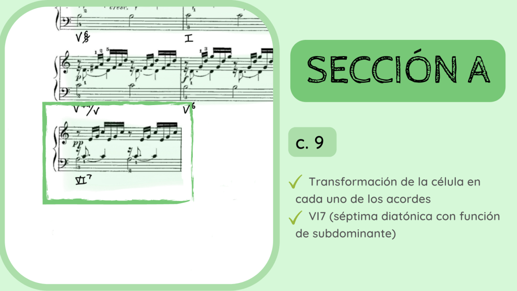 Tras la dominante secundaria esta resuelve en el IV. Por primera vez se rompe el motivo melódico-rítmico original y surge un acorde de IV desplegado que hacia mitad de compás presenta la nota Re, la que hace que el acorde se transforme del IV al II con séptima diatónica.