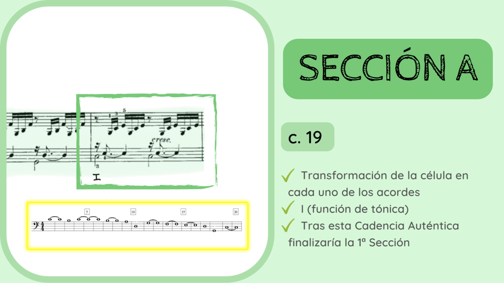 Resuelve en Tónica y hasta aquí el preludio podría dividirse en dos secciones por dos motivos. Primero porque ha tenido lugar una Cadencia Auténtica con su proceso cadencial de II con séptima, Dominante y Tónica. Segundo, porque la voz del bajo, que es muy importante, ha iniciado su descenso desde el Do central del piano, el Do3, hasta este Do2. Una especie de 1ª parada. Ahora seguirá su descenso en la siguiente Sección hasta el Do1. No obstante cabe señalar que esta división es puramente teórica puesto que este preludio se interpreta sin pausas, como un continuo.