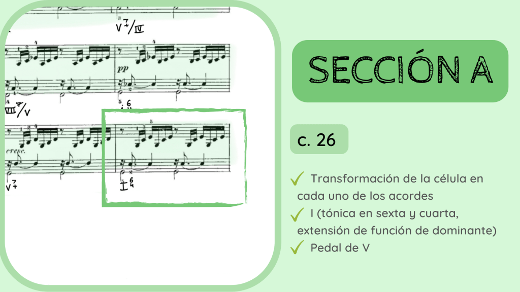 Con dicha pedal de Dominante ya se fija una alternancia de acordes de Tónica en sexta y cuarta cadencial y acordes con función de dominante. De esta manera se acumula mucha tensión armónica que habrá de resolver al final del preludio.