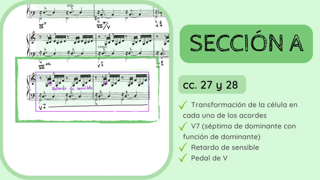 Estos dos compases los he englobado como si se tratasen de uno solo puesto que se trata de un solo acorde. La nota Do del c. 27 no es más que el habitual retardo de sensible, muy usado en el Barroco. De hecho, su sonoridad es muy característica y seguro que os es familiar.