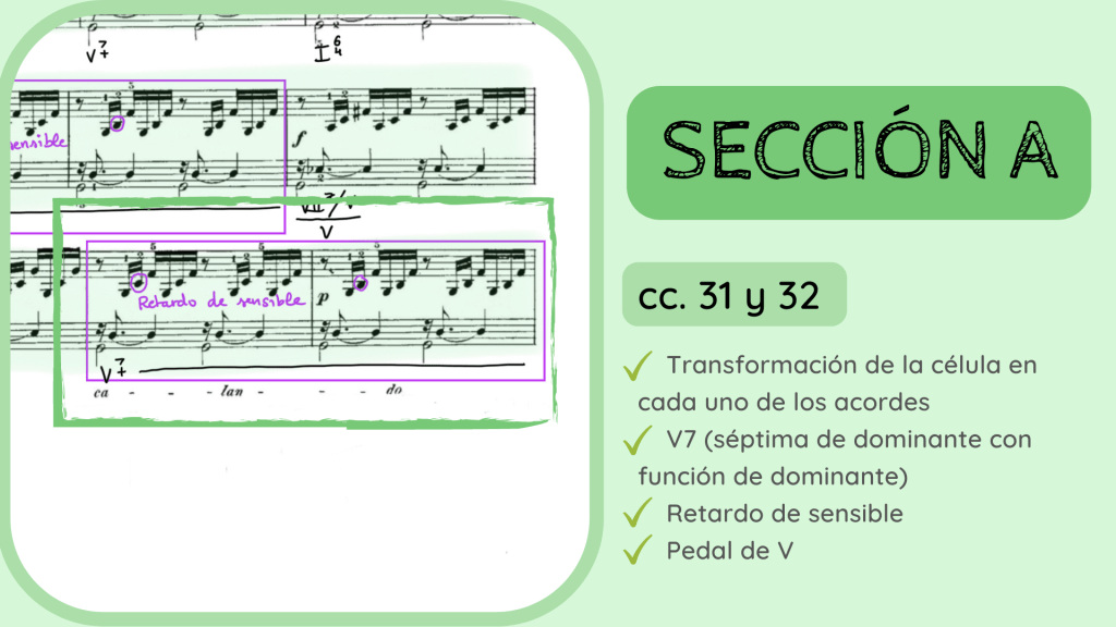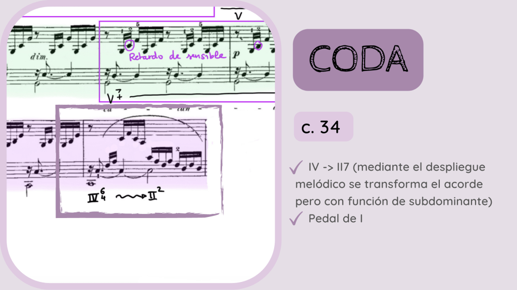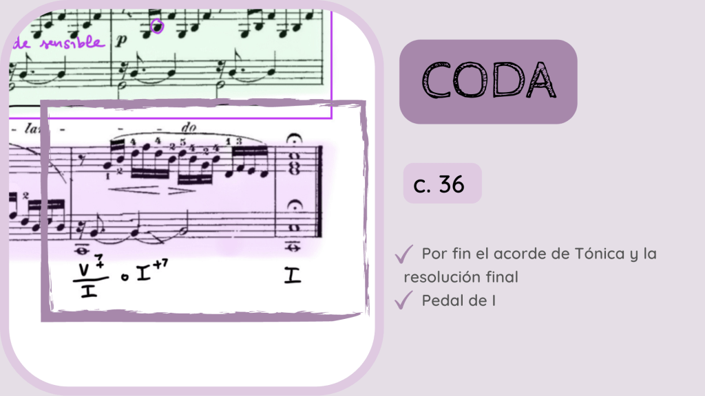 Con el patrón ya deshecho, llega el colofón final. Un acorde de sobretónica. Es decir, un acorde de Séptima de Dominante sonando sobre la propia nota Tónica (por cierto, lo mismo que había sucedido en el c. 29). Os he apuntado las dos formas más habituales de cifrar este acorde de Dominante sobretónica.