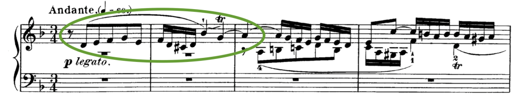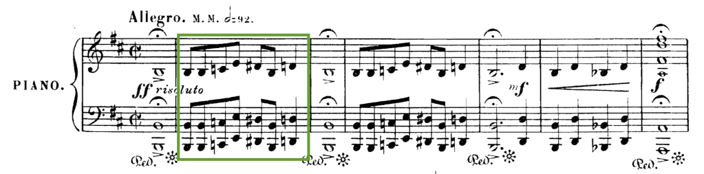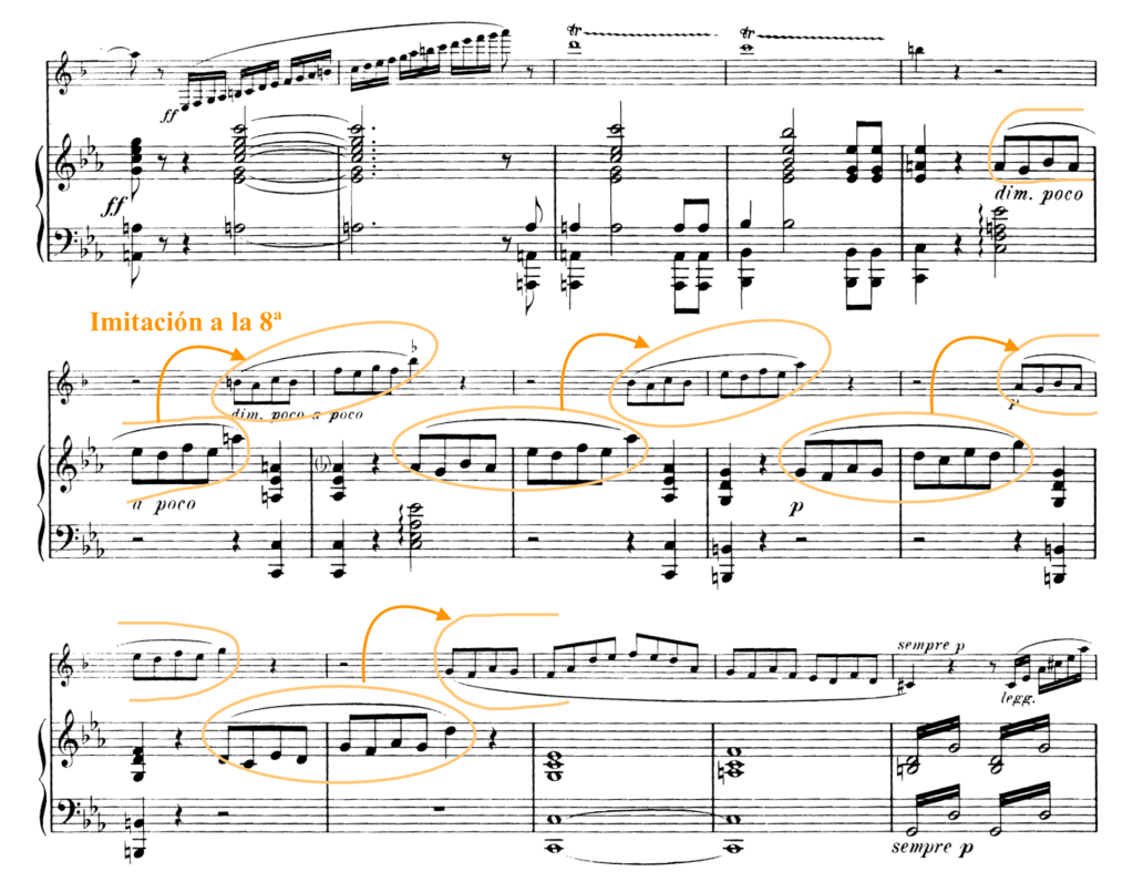 - Imitación por disminución. La voz que imita comprime la rítmica, reduce las figuras rítmicas. Veamos mediante varios ejemplos este. Son las imitaciones más recurridas y fáciles de encontrar en obras que sean, mayoritariamente, desarrollo de un material inicial muy pequeño, es decir, elaboración de un motivo temático-rítmico. El siguiente ejemplo es una de esas obras, la Sinfonía No. 2 del compositor ruso Aleksandr Borodin, que presenta en sus primeros compases el material que va a dar forma a todo el primer movimiento de la sinfonía (mismo proceso constructivo que Beethoven).