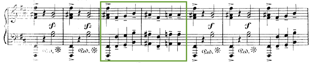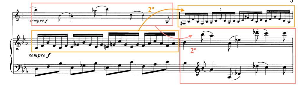 El mismo proceso de contrapunto invertible (pero esta vez a un intervalo distinto al ejemplo de Beethoven) lo encontramos en la figura siguiente, de nuevo del francés Camille Saint-Saëns. En ella se observa un intervalo de 2ª (puesto que el clarinete es un instrumento traspositor y está escrito en Sib). Cabe recordar que el intervalo se calcula siempre de forma ascendente.