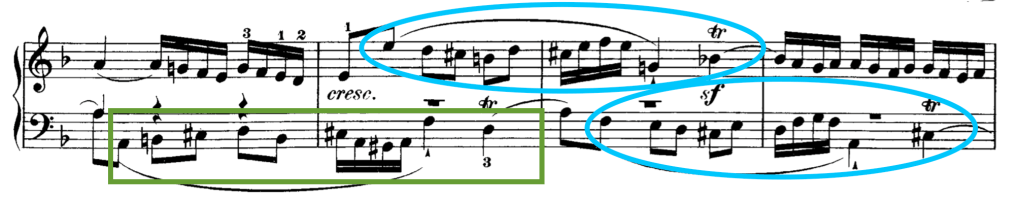 - Imitación por movimiento contrario o por inversión. La voz que imita comprime la rítmica, reduce las figuras rítmicas. Constituye la repetición de un elemento pero dándole la vuelta a los intervalos en su naturaleza ascendente o descendente. Lo visualizamos en un ejemplo del viejo Bach. Concretamente en su Fuga No. 6 en Re menor del Clave bien temperado I. En las figuras siguientes vamos a observar el sujeto de una fuga (como se denomina el material inicial, los primeros compases que Bach presenta) y en la siguiente se puede apreciar el sujeto dado la vuelta, se han invertido cada uno de sus intervalos, generando un dibujo “en espejo” (es decir, invertido y simétrico con respecto al original). La fuga se convertirá en una elaboración constante del sujeto o partes del mismo.