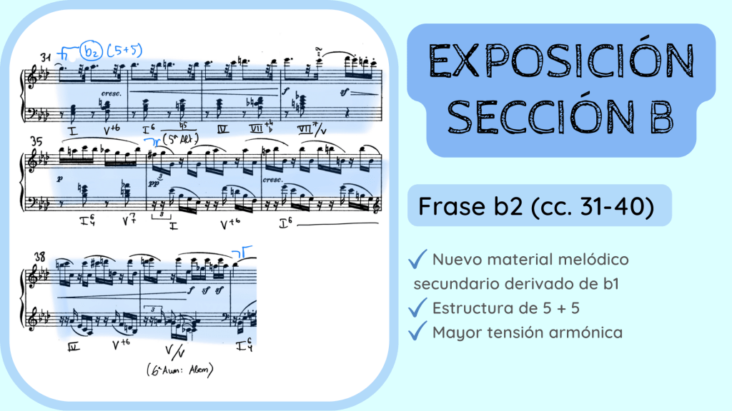 Da comienzo en el c. 31 la nueva frase b2 que se puede de nuevo separar en una estructura binaria de dos semifrases paralelas entre ellas, puesto que en esencia melódica y armónico son lo mismo. Esta nueva frase b2 es mucho más enérgica por ese acompañamiento placado en la mano izquierda que impulsa adelante la música debido a los acordes a contratiempo. A ello se le suma la proyección dinámica del crescendo y el carácter ascendente de la armonía y especialmente de la melodía.