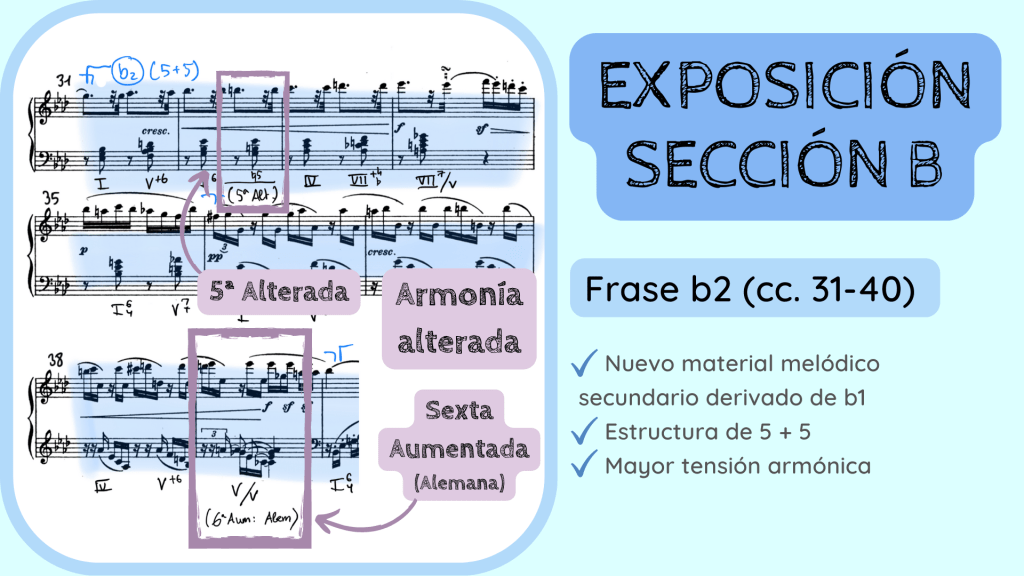 Además, armónicamente hablando, la frase b2 presenta una gran inestabilidad por sus cromatismos generados por los distintos acordes entre los que destacan: por un lado en el c. 32 y 36 un acorde de quinta alterada sobre la tónica, que no tiene otra finalidad que la de acorde de paso. Por otro lado, y donde reside casi todo el poder dramático de la frase es en la concatenación de dos acordes de séptima disminuida entre los cc. 33-34. También, en el c. 39, aparece otro acorde propio de la Armonía Alterada, un acorde de 6ª Aumentada que, como siempre, cumple una función de dominante de la dominante. Se trataría de una 6ª Aumentada de tipo alemana por la 5ª Justa que se forma entre el Dob y el Solb.