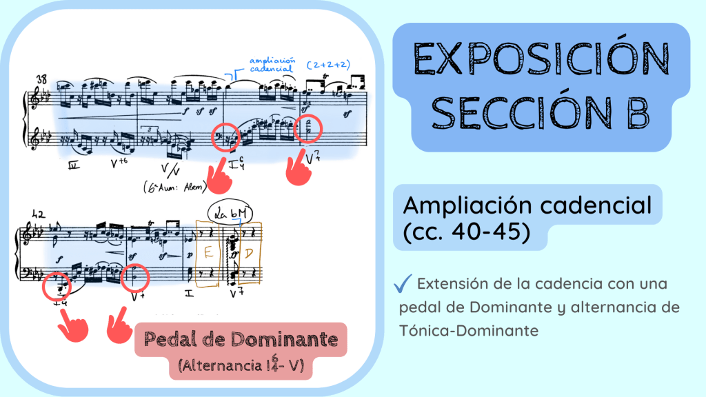 Tras este fragmento de tensión y una 6ª Aumentada de tipo Alemana, era previsible que apareciese un acorde de Tónica en sexta y cuarta cadencial. Y así ocurre, pero de una forma no conclusiva ya que, como se puede observar, entre los cc. 40-43 tenemos una pedal de la nota Sib, la dominante. Dicha pedal provoca una no resolución hasta el c. 44 donde por fin aparece la Tónica en estado fundamental. Esta prolongación de la función de dominante se puede catalogar como una ampliación cadencial que nos alarga el final hasta el c. 44.