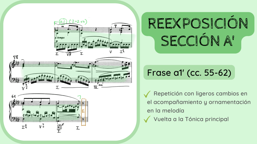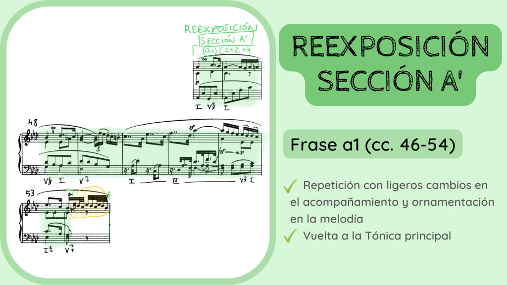 La reexposición queda claramente definida al encontrarnos, prácticamente igual pero con adornos, la frase a1. Se inicia la Sección A’ y, además, la frase a1 que se mantiene con su estructura binaria, su sintaxis armónica e, incluso, reaparece el enlace melódico del c. 53.
