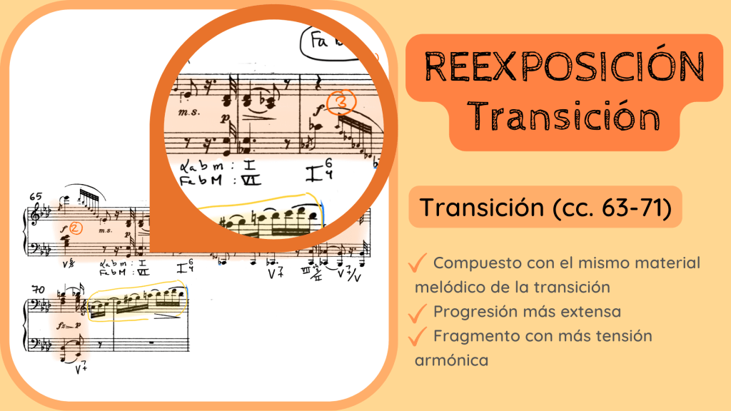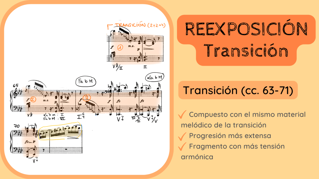 La transición en cambio sí posee alguna diferencia. Hay que tener en cuenta que el material de la transición en la Exposición se encarga de conducirnos de la Tónica principal hacia la tonalidad de la Sección B. Pero en la Reexposición ocurre que, normalmente, tanto la Sección A’ como la Sección B’ se escuchan en la Tónica principal. Por lo tanto, la transición ahora nos llevará de Lab Mayor, a otra vez, Lab Mayor. La transición ahora tiene un compás más. Se inicia de la misma manera, con una dominante secundaria del II que resuelve en un II. Estos dos compases forman el modelo de la progresión que se repetirá dos veces más, igual que antes, con el proceso que conocemos como Método 1, 2, 3.