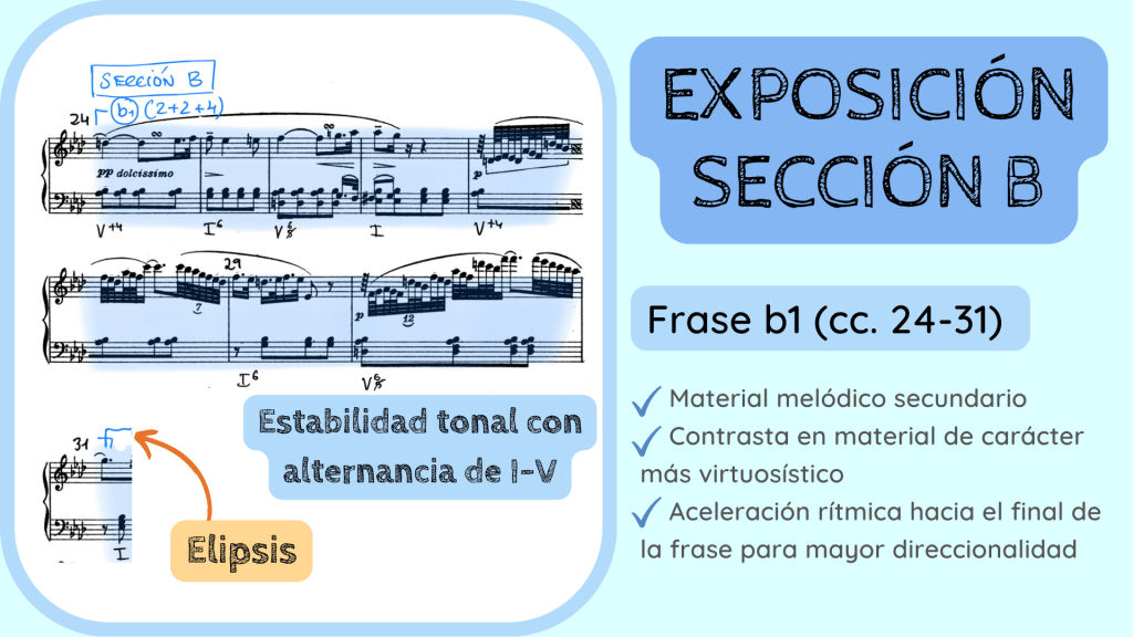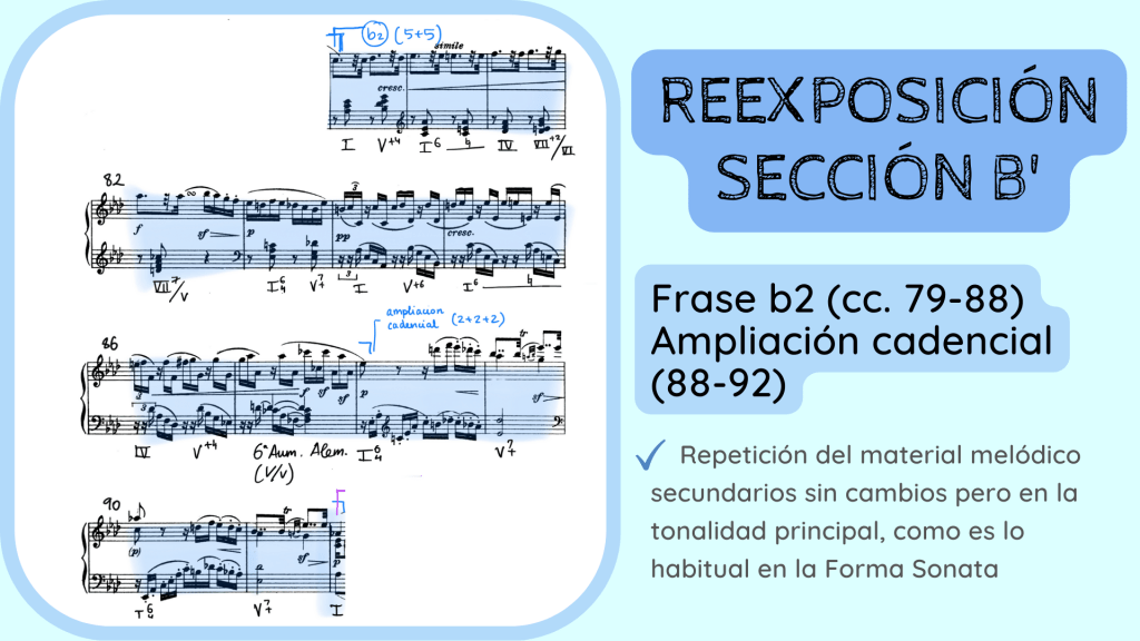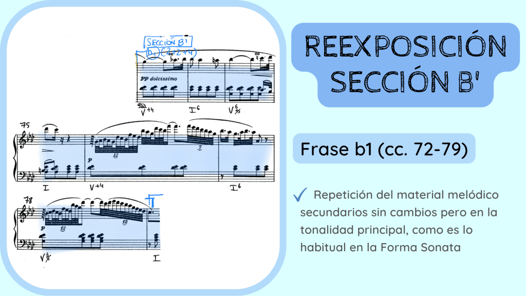 Y así se inicia la frase b1 que resulta ser exactamente igual a la de la Exposición. Ahora la estabilidad armónica de la alternancia de Dominante y Tónica implanta de nuevo la tonalidad de Lab Mayor (después de la transición). Esta vuelta a la Sección B’ y a la tonalidad principal nos da la característica principal para saber que es una Forma Sonata sin desarrollo. Si la sección B’, al repetirse, hubiese mantenido una tonalidad distinta a la principal estaríamos ante una estructura de Rondó.