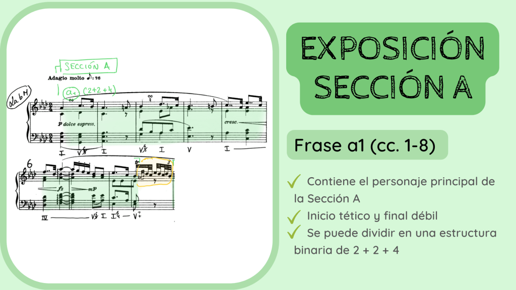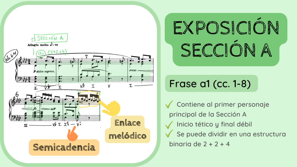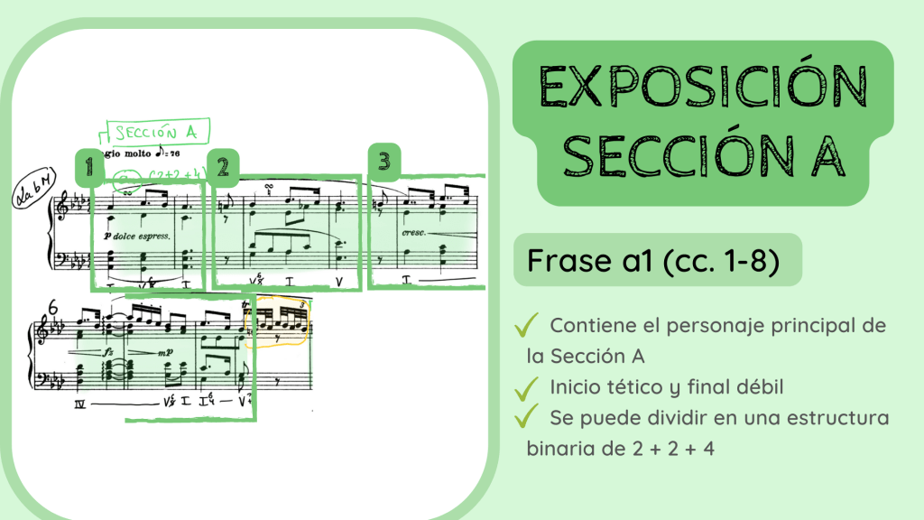 Con esta primera frase a1 se establece la tonalidad y el material melódico-rítmico protagonista. En la Forma Sonata encontraremos varios materiales melódicos agrupados bajo una tonalidad. En este caso Lab Mayor, que define toda la Sección A.