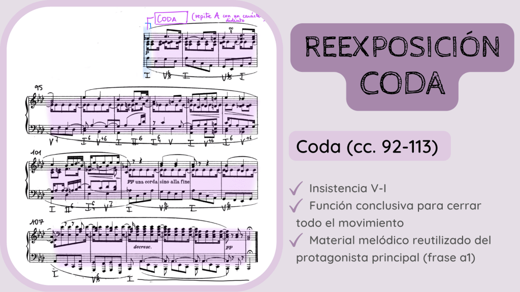 Tras toda la reexposición repetida y la Cadencia Auténtica marcada, la obra finaliza con una Coda. En ella encontramos al personaje protagonista, en los cc. 92-99, que es igual en su inicio a la frase a1. Aparece de nuevo en Lab Mayor lo que podría hacer pensar que la obra se trataba de un Rondó y que se repetía una vez más al protagonista principal, pero no. La manera en que se presenta el tema de nuevo, transformándolo, y su armonía básica con alternancia de Dominante y Tónica le dan un carácter conclusivo a este pasaje (especialmente a partir del c. 103). Es por ello que este fragmento es la conclusión de la obra y no otra Sección A.