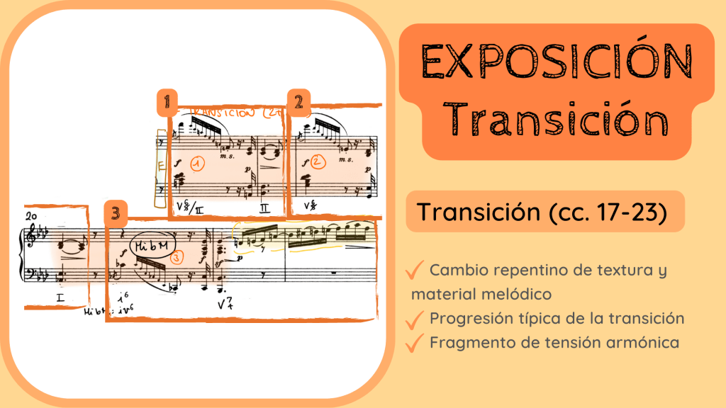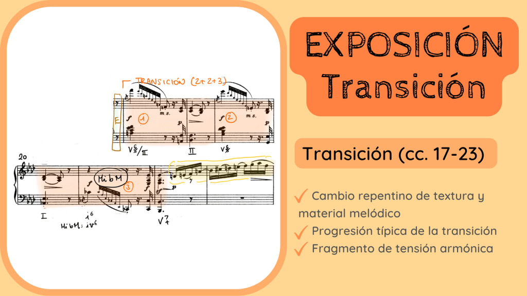Y efectivamente, aparece así la transición. Las características de esta sección son siempre las mismas, lo hemos visto en otros vídeos: la transición implica movimiento armónico y melódico, progresiones e inestabilidad armónica. Y así es. La progresión salta a la vista con esa retahíla de fusas en forma de arpegios descendentes.