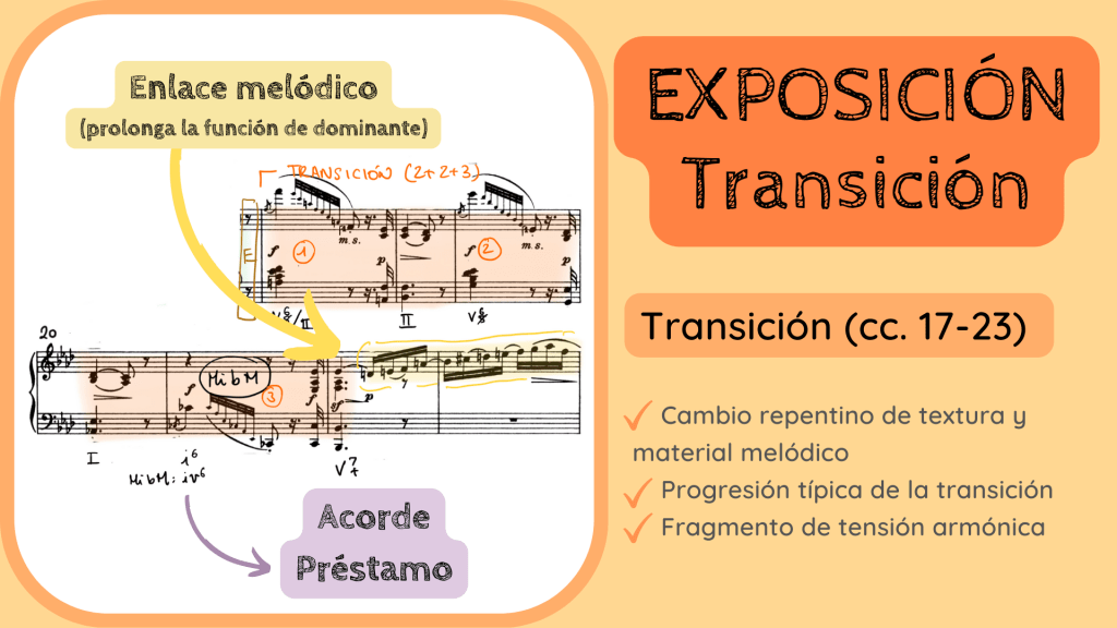 Armónicamente es lo que esperábamos de una transición, gran cantidad de alteraciones e inestabilidad armónica. La progresión contiene primeramente un desvío hacia Sib menor, es decir, el II de Lab Mayor. Es por ello que sobre la partitura se analiza como una Dominante secundaria del II en el c. 17 que resuelve en un II en el c. 18. En el c. 21 encontramos un acorde desplegado de Lab menor. Es decir, la tónica principal cambiada de modo. Es por ello que se cifra como i latina, para representar un acorde préstamo. Este acorde sirve como acorde puente entre la tonalidad de partida y la tonalidad a la que quiere llegar Beethoven. Se trataría también de un IV prestado de Mib Mayor. Es decir, que el mismo acorde préstamo le sirve como Tónica y Subdominante de la nueva tonalidad, que acaba confirmándose en el siguiente compás con la séptima de dominante. Las nuevas sensibles y el acorde préstamo generan una cantidad considerable de alteraciones que son consecuencia de una mayor actividad armónica y su inestabilidad.