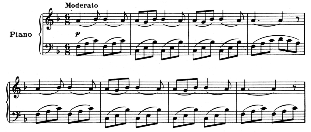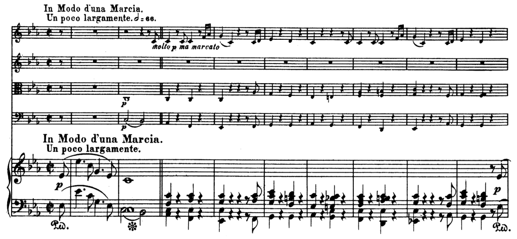 Esta última melodía, del genial Quinteto para piano Op. 44 de Schumann se muestra entrecortada, pausada y melancólica, incidiendo sobre la nota dominante (Do) de la tonalidad (Fa menor). Además, como se puede apreciar en la indicación de tempo, in modo d’una Marcia (a modo de una marcha).