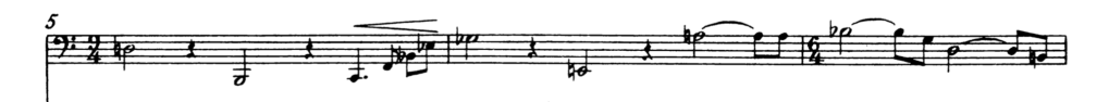 La figura 31, la melodía que inicia la Sonata para tuba de Hindemith, realiza una línea quebrada, zigzagueante y frenética por sus grandes saltos interválicos, lo cual le confiere un carácter nervioso y agitado. Además presenta un gran registro del instrumento en un breve periodo de tiempo (desde el Sib0 al Sib2)[2].