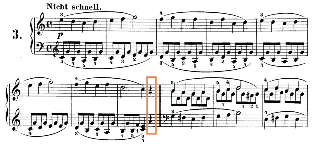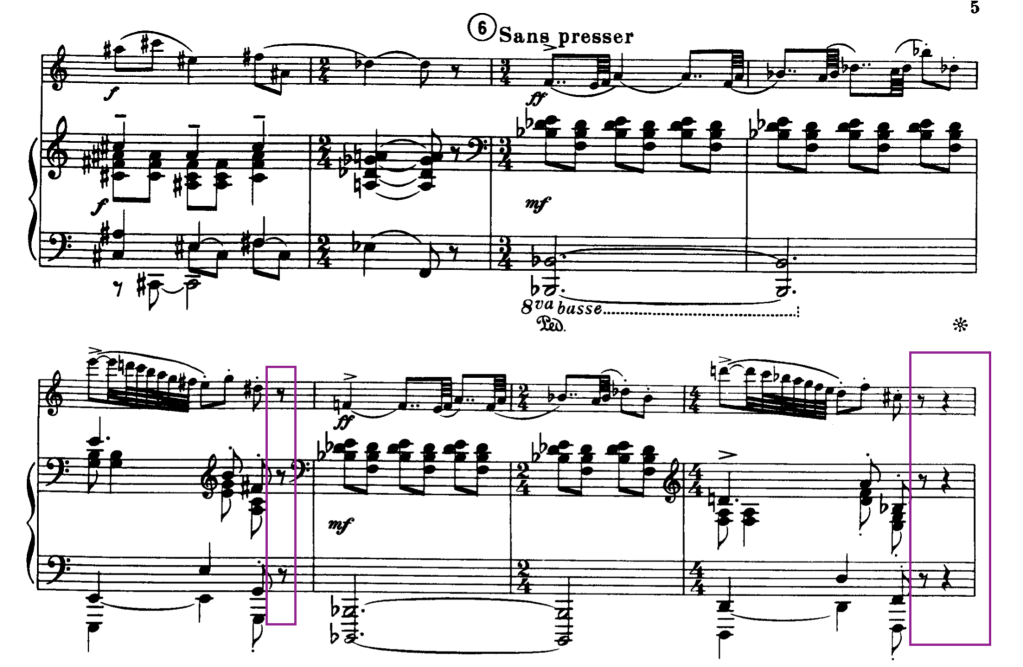 El silencio dramático sería aquel cuya función es generar y aportar más tensión en una obra o fragmento musical. Puede también ser utilizado por el compositor para frustrar las expectativas del oyente como, por ejemplo, evitar una cadencia perfecta que era muy esperada. Este silencio también puede generar un momento de anticlímax (como en la figura 21), por ejemplo, una sección que va aumentado poco a poco de dinámica hasta alcanzar un fortissimo y, de repente, aparece un silencio.