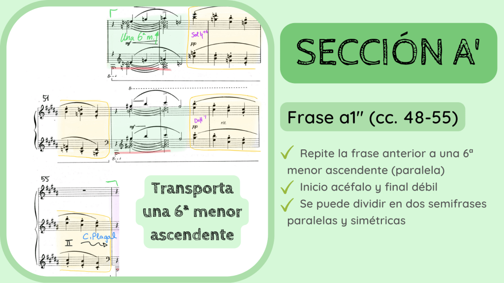 Lo primero que salta a la vista, a parte de la escritura en tres pentagramas para el pianista, es la pedal de Tónica, una característica típica de las codas. Todo el fragmento se construye básicamente sobre el acorde de Tónica: Si-Re#-Fa# pero con una nota añadida. Efectivamente, la sexta añadida, el Sol# (exactamente como había ocurrido antes, en la frase a1’). La sensación cadencial la encontramos justo antes de la resolución en la tónica, cuando se genera una Cadencia Plagal entre los cc. 55-56 con un II-I (por cierto un rasgo típico de la música neomodal e impresionista de finales del siglo XIX y principios del XX, recuperar el uso de la Cadencia Plagal, prácticamente en desuso entre el Clasicismo y el Romanticismo).