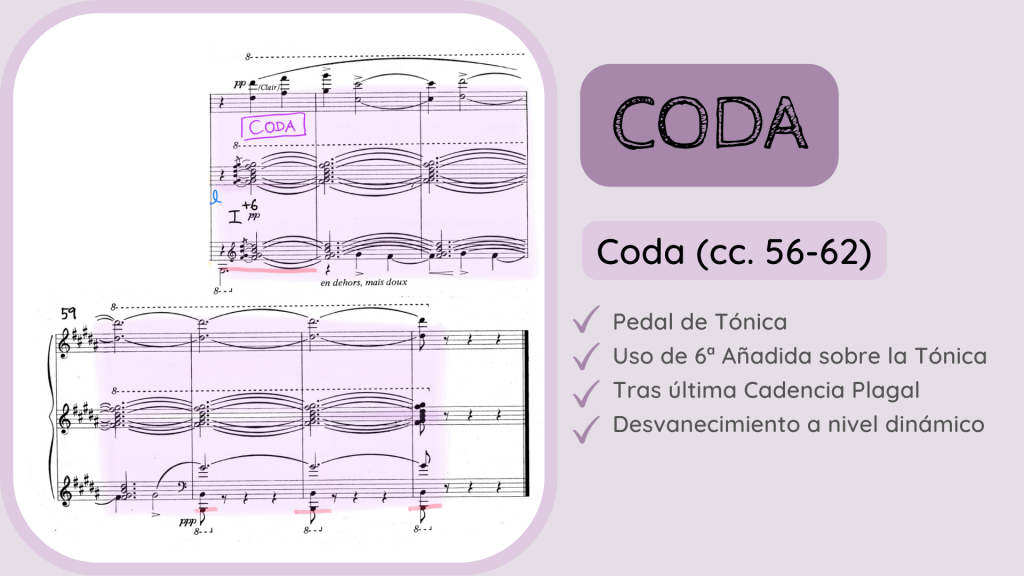 Para finalizar la pieza aparece la Coda. Vamos a mencionar varios elementos destacables de este último fragmento.