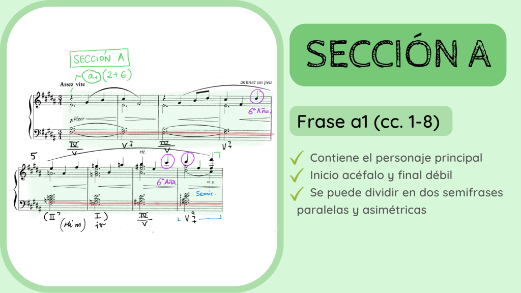 Toda la armonía de esta primera frase a1 alterna las funciones de Tónica, Subdominante y Dominante en un contexto tonal y sobre una pedal de Dominante (a excepción de los acordes de los cc. 5 y 6 que están fuera del contexto de Si Mayor). Se pueden justificar como un II y I de Mi menor, el IV grado prestado de nuestra tónica principal (acordes préstamo). La armonía acompaña para reforzar la música hacia el punto climácico del c. 8 que ya hemos comentado, ya que además se crea suspense con la semicadencia sobre la Dominante.