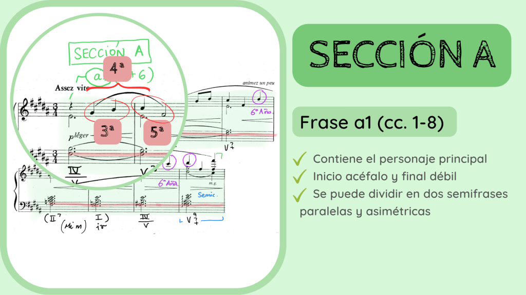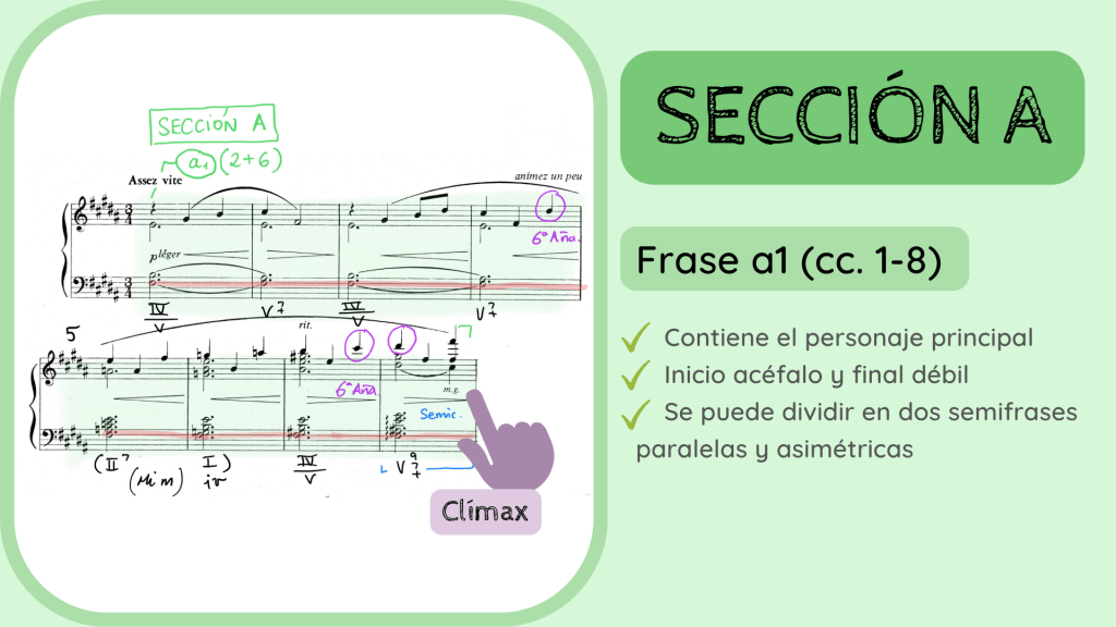 Viendo la frase a1 se puede observar que presenta una asimetría con sus ligaduras de 2 + 6 compases. Su inicio es acéfalo, a contratiempo y su final débil. Si nos centramos en su inicio melódico se observa el motivo principal y generador de la obra en ese Sol#-Si-Do#-Fa#. Este elemento aparecerá constantemente a lo largo de la pieza. La línea melódica genera a su paso distintos intervalos de 3ª m, 2ª M y 5ª J, así como un movimiento ascendente de 4ª J seguido del mencionado de 5º J. Cuando en los cc. 4-5 se repite el motivo éste se extiende a lo largo de 5 compases más y sus intervalos se van aumentando y hacen que la melodía se proyecte siempre hacia arriba, de forma ascendente hasta alcanzar el clímax en la octava de Fa#. Es curioso ver como va a más, fijaos: en el c. 5 aparece un salto de 6ª, en el c. 6 un intervalo de 7ª y finalmente en el clímax una 8ª.