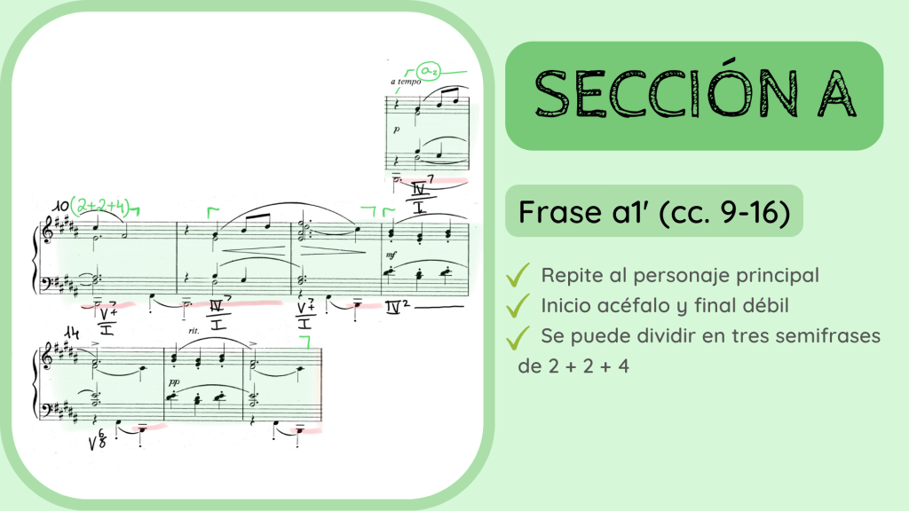 Este nuevo fragmento es totalmente homofónico y se construye en base a una repetición literal de los cc. 13 y 14. Las voces se mueven de forma paralela a través de las distintas notas del acorde del IV con séptima diatónica. Sobre este paralelismo surge la melodía en la voz superior, que se construye a través de los intervalos del motivo original, haciendo un dibujo muy parecido de 3ª menor ascendente y 4ª Justa descendente. Al final de la frase a1’ la indicación agógica de ritardando que nos frena más la dinámica pianisimo nos conducen hacia el final de la frase y, por lo tanto, a la siguiente sección.