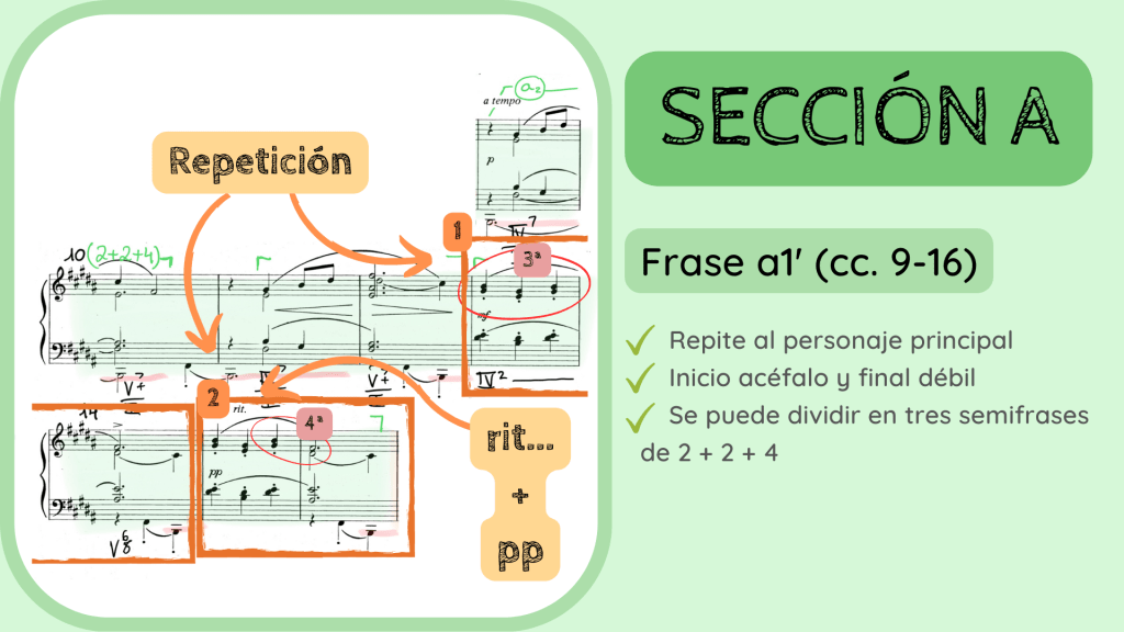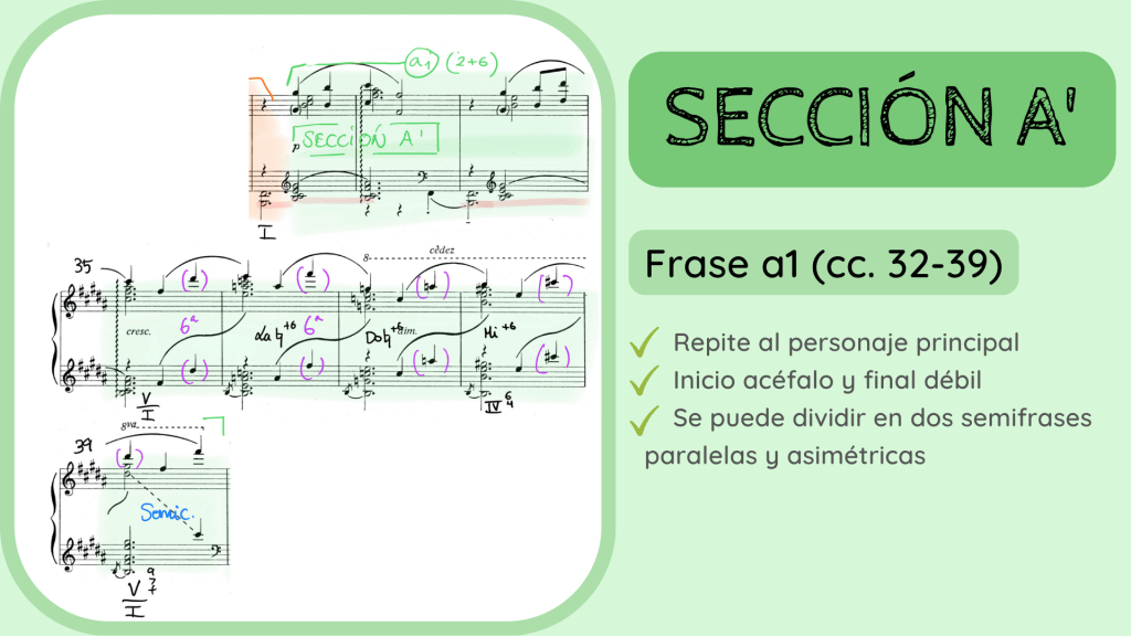 Y así, en el c. 32 con el inicio acéfalo original reaparece la Sección A’ y, con ella, toda la frase a1 aunque cambiada: la melodía se ha reforzado con octavas, la pedal ahora es de Tónica y sobre ésta se despliegan grandes y extensos acordes que simulan un arpa y el registro de la melodía se ha incrementado llegando hasta una octava más aguda que antes, con el último Fa# del piano.