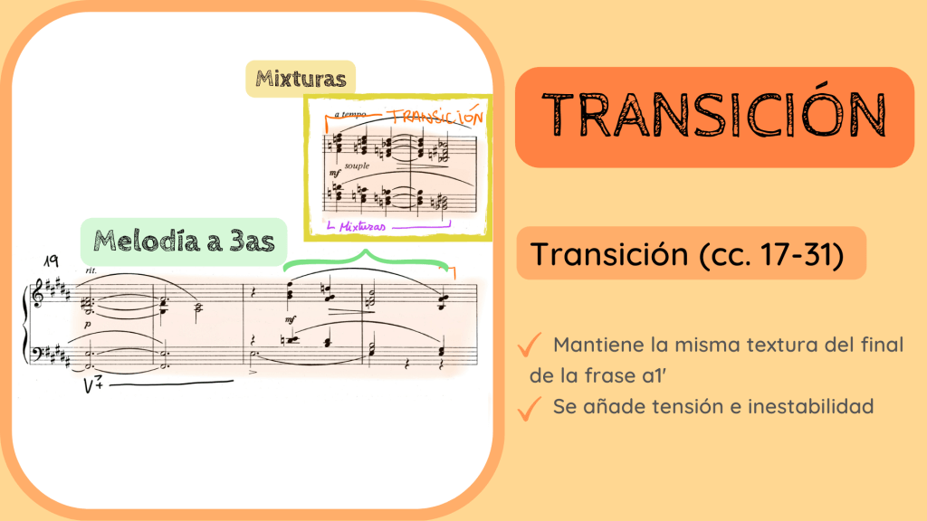 La transición arranca con un a tempo, pero importante, ¿por qué le denominamos transición y le damos ese carácter? Este fragmento continúa con la homofonía igual que terminaba la frase anterior pero ocurre algo, ahora no es una homofonía cualquiera. Sus voces se mueven todas de forma paralela y se genera por tanto lo que se conoce como mixturas (aunque quizás esta textura la conozcáis por otro nombre). En cualquier caso su característica principal es el paralelismo de acordes y es otro rasgo del impresionismo. Y con esta mixtura, además ocurre algo aún más determinante para saber que es una transición. Me refiero a que se introducen numerosas alteraciones que escapan al centro tonal de Si. Cabe señalar, como curiosidad, que la mixtura parece simular una escala hexátona o de tonos enteros sobre todo con el acorde final de 5ª aumentada. Pero realmente no es dicha escala puesto que tenemos cromatismos como el producido entre las notas Fa-Fa#.