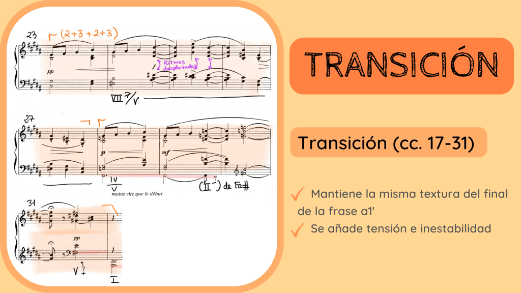 La siguiente parte de la transición presenta también elementos de inestabilidad propios de dicha sección. Por un lado los ritmos desplazados y sincopados que encontramos entre los cc. 24-26. Por otro lado la armonía y la melodía que se mueven por un acorde de Séptima Disminuida que parece realizar la función de dominante de la dominante. El proceso cadencial lo encontramos en el c. 29 con una subdominante en forma de 6ª Napolitana de Fa#, es decir, la dominante del tono principal. Hablamos del acorde Sol-Si-Re. Tras ésta 6ª Napolitana y su calderón (que aumenta la tensión), le sigue la Dominante y la Tónica que resuelven toda la tensión anterior en una Cadencia Auténtica en tiempo fuerte sobre el c. 31.