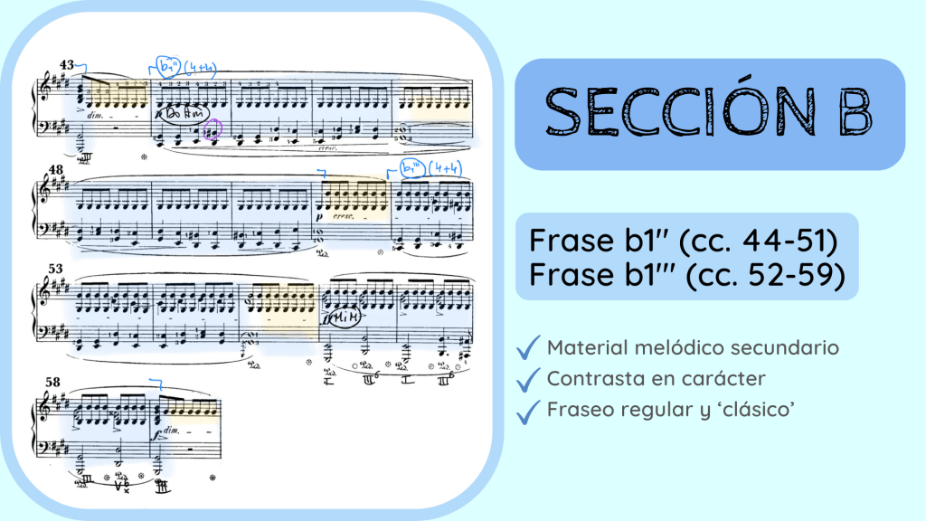 A partir del c. 44 se vuelven a repetir las dos frases anteriores, por lo que escuchamos ahora las frases b1’’ y b1’’’. La tensión se vuelve a acumular y a explotar en el c. 56. Nos encontramos ante un proceso de repetición literal por parte del compositor, poco común ya que se suelen variar algunos de los elementos para no mostrarlos, de nuevo, exactamente iguales.
