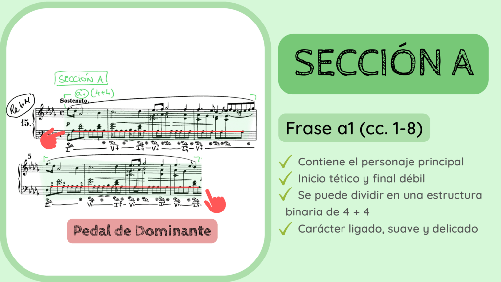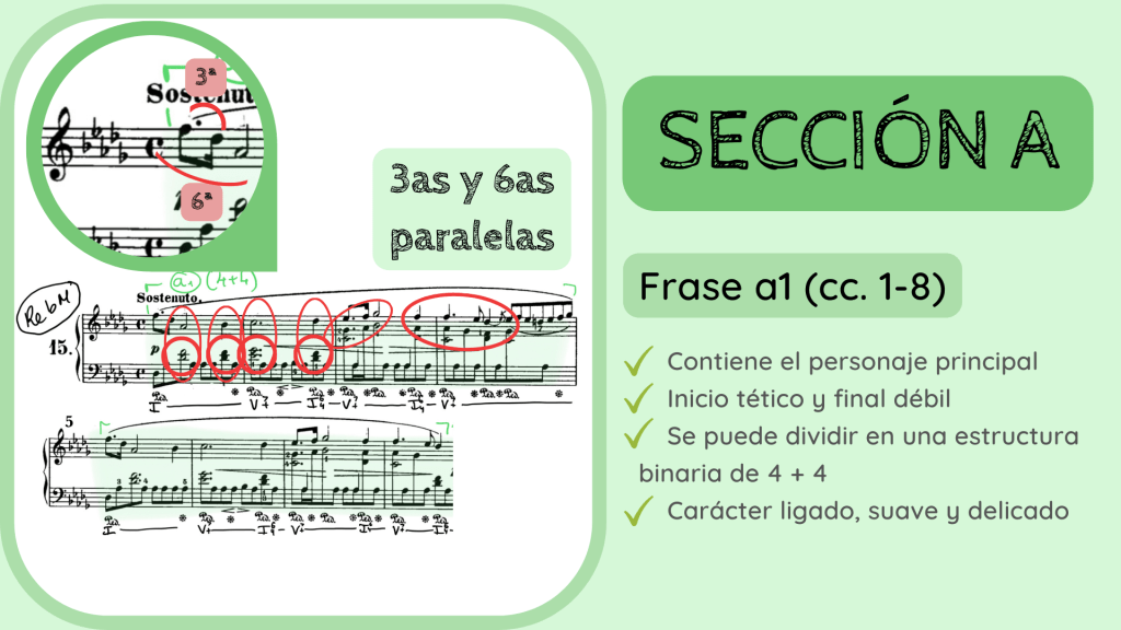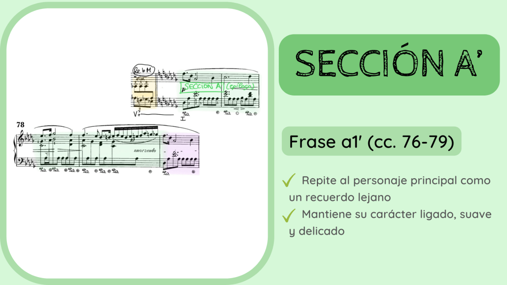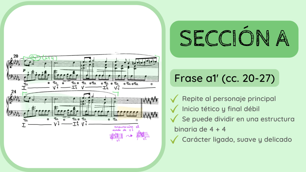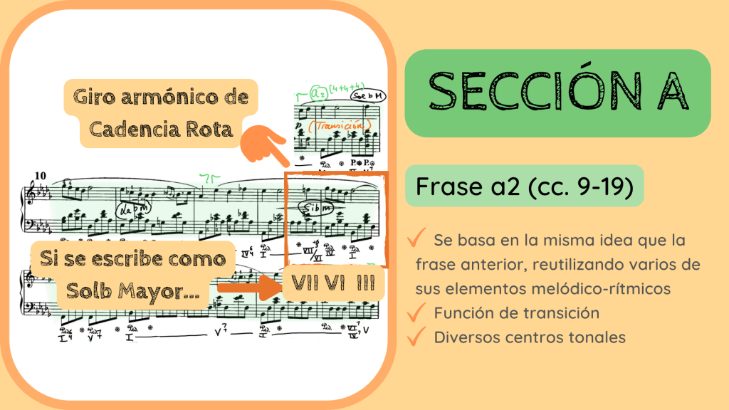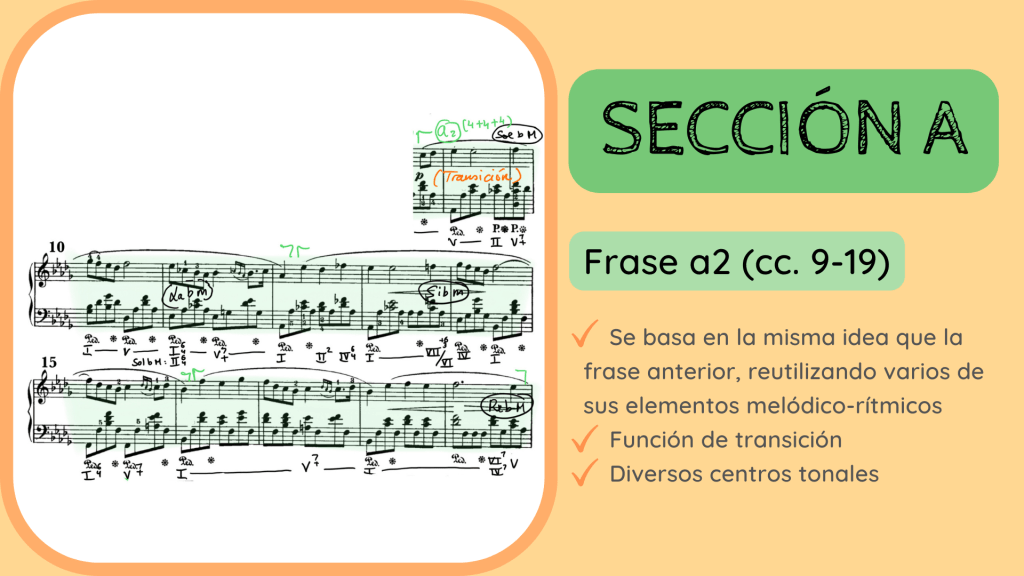 Durante la siguiente frase la estabilidad tonal desaparece. La frase a2 pasa, durante su trayecto entre los cc. 9 al 19, por distintas tonalidades: Solb M, Lab m, Sib m y regresa, justo al final, a Reb M. Esta es una característica habitual en el repertorio romántico, que la estabilidad armónica se desvanezca desde los mismos inicios de la obra. Esta frase, sin embargo, trabaja el material inicial ya que continúa la misma textura de melodía acompañada y una melodía muy similar. Es por ello que denomina a la frase como a2 y, a la vez, tiene una función de transición. Aporta una cierta inestabilidad que nos lleva de la presentación del personaje en la frase a1 a su repetición que sonará a partir del c. 20, la frase a1’. De ahí que utilice el verde para reflejar que la frase es de la Sección A pero que su función es transitiva.