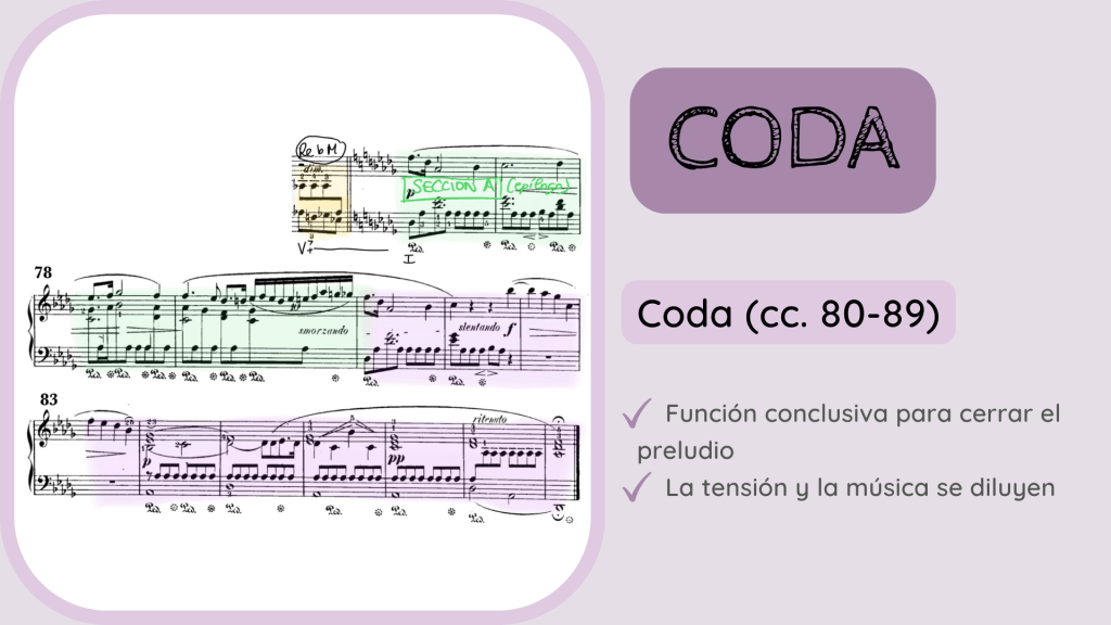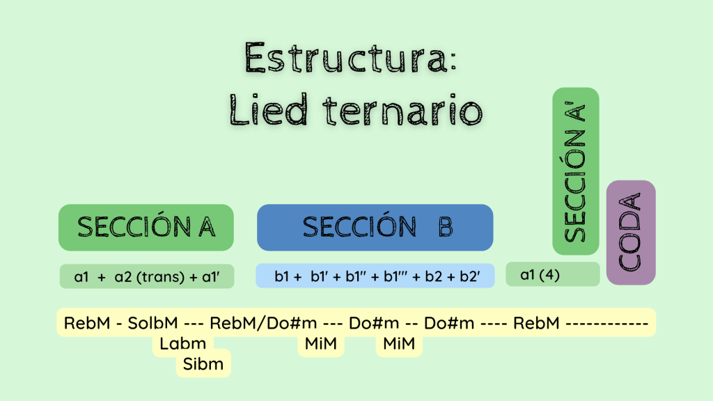 Concluimos este análisis con el esquema que refleja la estructura del preludio. Se puede clasificar en una estructura de lied ternario teniendo en cuenta lo mencionado en esa doble función de la sección A’. Como es habitual en las obras románticas, al contrario que las obras del Clasicismo, la armonía puede presentarse ya de forma inestable, con modulaciones dentro de la propia Sección A que cumple una función expositiva. Es por ello que dividir las secciones en una obra romántica no es tan claro y cristalino como en una obra clásica. Debemos concluir siempre cuáles son las funciones de las frases y secciones que estamos analizando para así determinar su estructura musical.