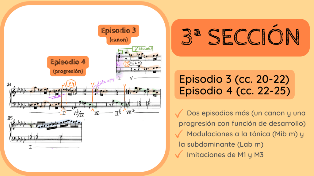 La 3ª SECCIÓN se inicia con un proceso contrapuntístico imitativo que todos conocemos; con un canon. Es decir, que se inicia en la parte superior del c. 20 una línea melódica que es repetida e imitada justo una blanca después por la voz inferior a 8as. Ambas voces finalizan este proceso en el tiempo fuerte del c. 22. Este canon lo he definido como el Episodio 3. Justo en su final empieza el Episodio 4, que se repetirá casi dos veces más.
