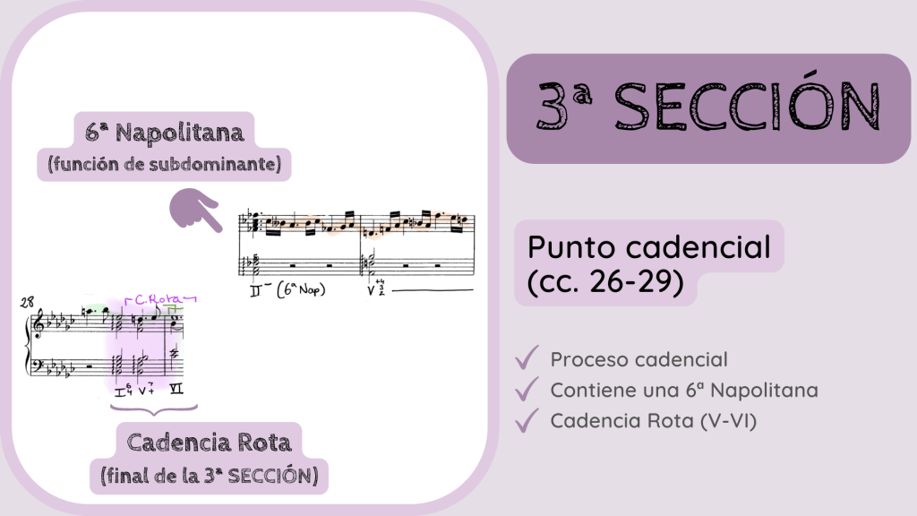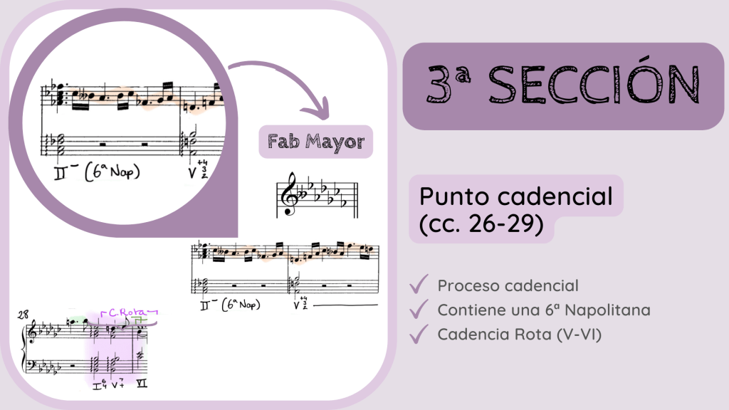 … tenemos aquí uno de los elementos más interesantes, armónicamente hablando, de la pieza. El uso de una 6ª Napolitana que inicia el proceso cadencial final y que, por ello, retrasa la cadencia y el final de esta 3ª SECCIÓN hasta el c. 29. El Fab aparece como un II rebajado un semitono formando así la 6ª Napolitana. Esta resuelve y se conduce con su uso habitual a la Dominante para terminar haciendo la cadencia. Pero si os fijáis en los cc. 28-29 el sexta y cuarta cadencial no resuelve al acorde de Tónica sino que provoca una Cadencia Rota, va a un VI. Vamos a escucharlo (audio).