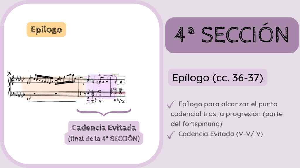 La última progresión, es decir, el Episodio 2, nos conduce al epílogo que tiene la función de concluir y finalizar todo el proceso del fortspinung. De hecho su armonía es tonalmente conclusiva y nos lleva a la Cadencia Auténtica de los cc. 15-16. Vamos a escucharlo.