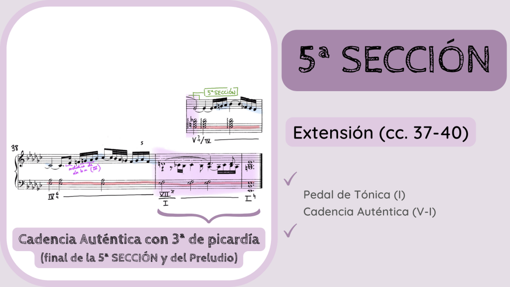 A partir de la Cadencia Evitada se establece una última parte, la 5ª SECCIÓN que se caracteriza, principalmente, por tener una larga pedal de Tónica en el bajo. Y este hecho precisamente dota a la Sección de un carácter conclusivo. El c. 37 es un acorde de Dominante del IV que resuelve en el c. 38 en, por supuesto, un IV en seis cuatro de ampliación o prolongación. El c. 39 es un acorde final de dominante Sobretónica en forma de Séptima Disminuida que acaba resolviendo, por fin, sobre la Tónica en el compás final y ahora sí que sí en estado fundamental. Y con ese giro sorpresivo y cliché del Barroco, el acorde final de Tónica sufre una transformación al modo Mayor, lo que se denomina como 3ª de picardía.