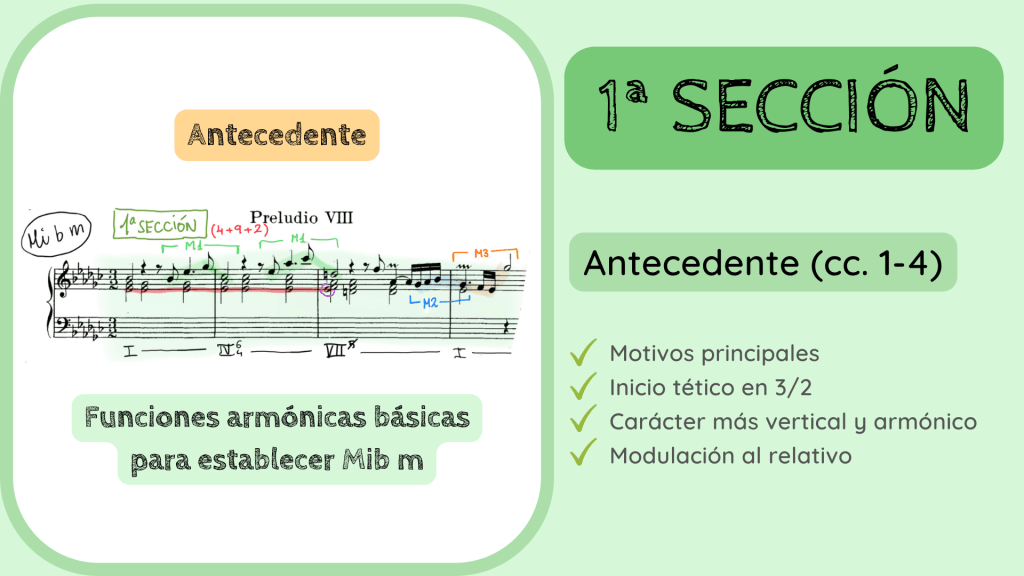 Seguimos con el preludio y con la 4ª SECCIÓN que se inicia con un Antecedente. Este fragmento está en la tonalidad de Lab menor ya que la Cadencia Rota le sirve a Bach para establecer esta tonalidad con una armonía de Tónica, Dominante y Tónica. En este fragmento tiene un gran protagonismo el M2 de las semicorcheas, marcado en la diapositiva con círculos de color azul.