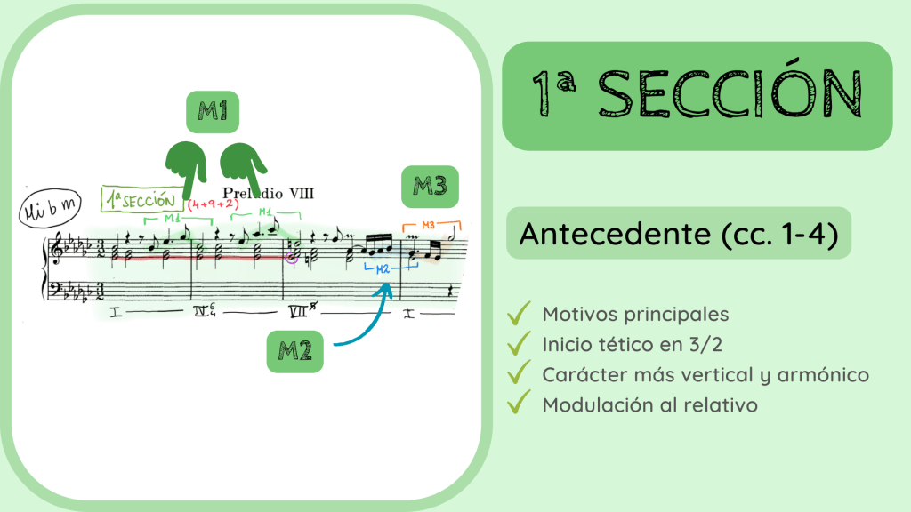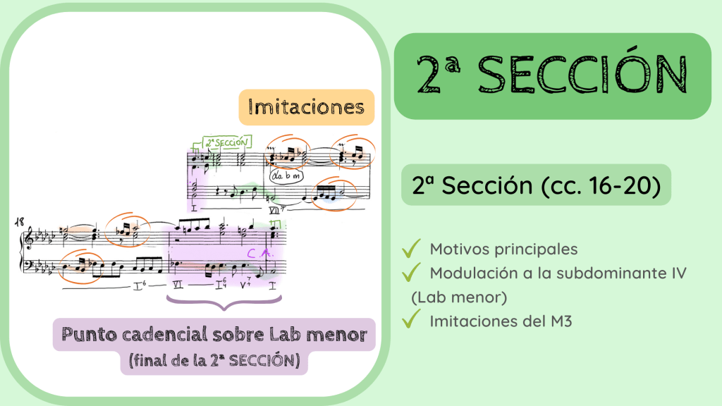 La 2ª SECCIÓN sigue conteniendo los tres motivos principales pero tiene especial protagonismo el M3, subrayado en color naranja ya que se imita hasta en cinco ocasiones y va conduciendo el discurso musical hacia el siguiente punto cadencial. Este lo encontramos entre los cc. 19-20 formando otra Cadencia Auténtica pero esta vez sobre Lab menor, la subdominante de la tonalidad principal.