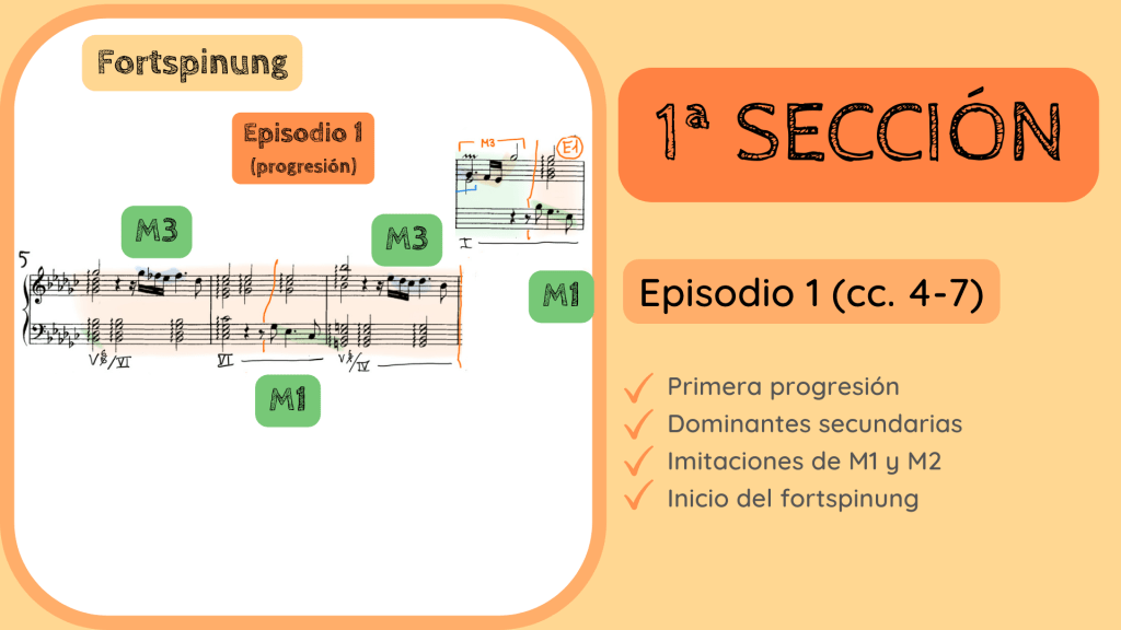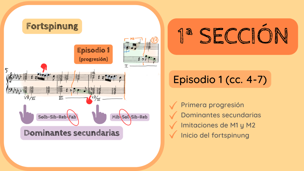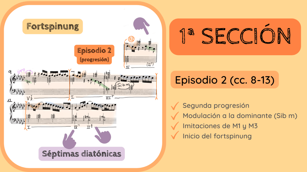 De nuevo tiene lugar otra progresión y distinta a la anterior. Es por ello que la denomino como Episodio 2. Se establece un modelo entre los cc. 8-9 y en los cc. 10-11, también marcados con corchetes naranjas en la diapositiva se repite y, al final de ésta, la armonía modula hacia la tonalidad de Sib menor, la dominante de la tonalidad principal.
