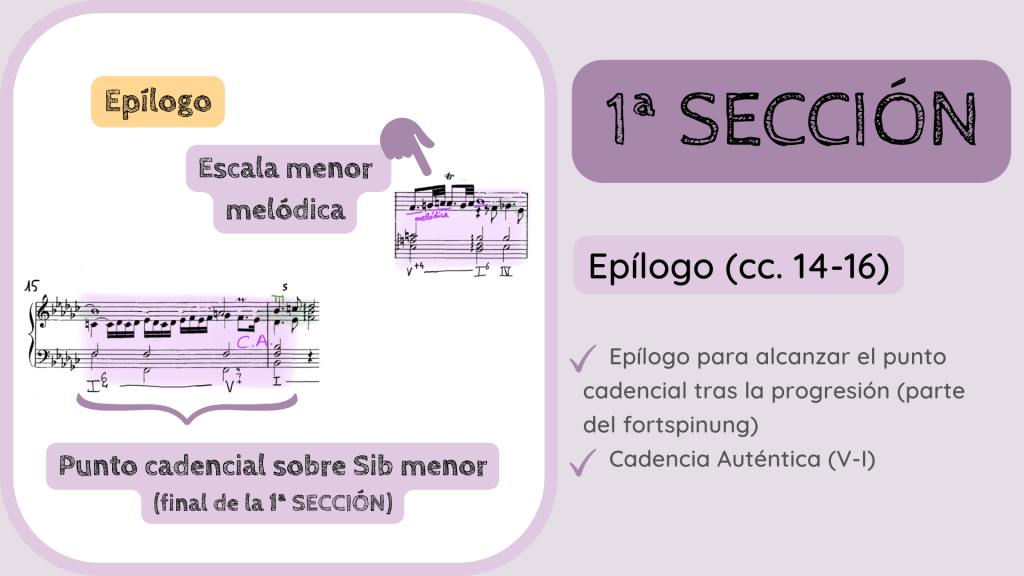 Vemos también el detalle de la escala menor melódica ascendente que aparece en el c. 14 en su contexto habitual de acorde de dominante. Con este punto cadencial fuerte en forma de Cadencia Auténtica sobre Sib menor se finaliza por tanto la 1ª SECCIÓN. Y recordad que el fortspinung no tiene por qué coincidir y aparecer a lo largo de una sección. Ni tampoco tiene por qué aparecer siempre. Ahora sí se ha dado el caso porque teníamos una parte expositiva, otra de progresiones (con los dos episodios) y una más conclusiva. De hecho, la siguiente sección no contendrá ningún fortspinung.