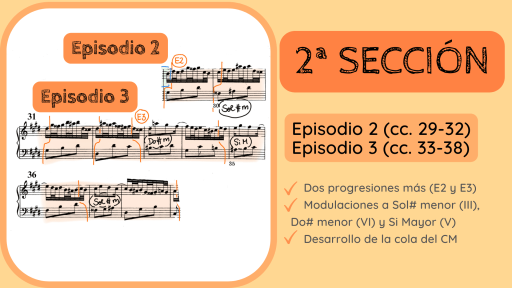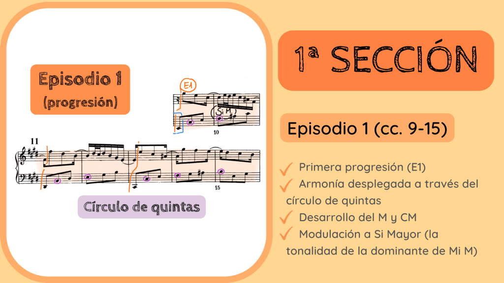 Como es habitual en Bach, después de un momento expositivo ahora presenciamos la primera progresión, es decir, lo que es en esencia un episodio. En muchos tratados y apuntes se denominan también a los episodios como divertimentos. Por lo tanto etiqueto este pasaje como E1 y mediante los corchetes que veis en la diapositiva en color naranja establezco el modelo y las veces que éste se va a repetir. El modelo lo tenemos en los cc. 9-10. Este se repite justo después, en los cc. 11-12 descendiendo una 2ª M y modulando a Si Mayor, la tonalidad de la dominante de la principal. Y, de nuevo, se repetirá otra vez descendiendo otra 2ª M en los cc. 13-14 aunque ya variando el final del modelo.